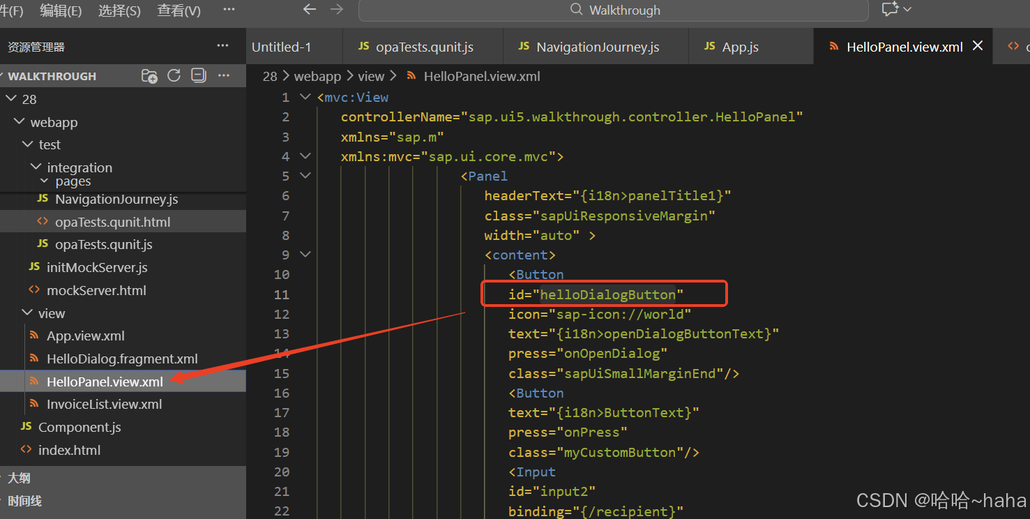 sViewName = "sap.ui5.walkthrough.view.HelloPanel"为验证的页面视图文件路径