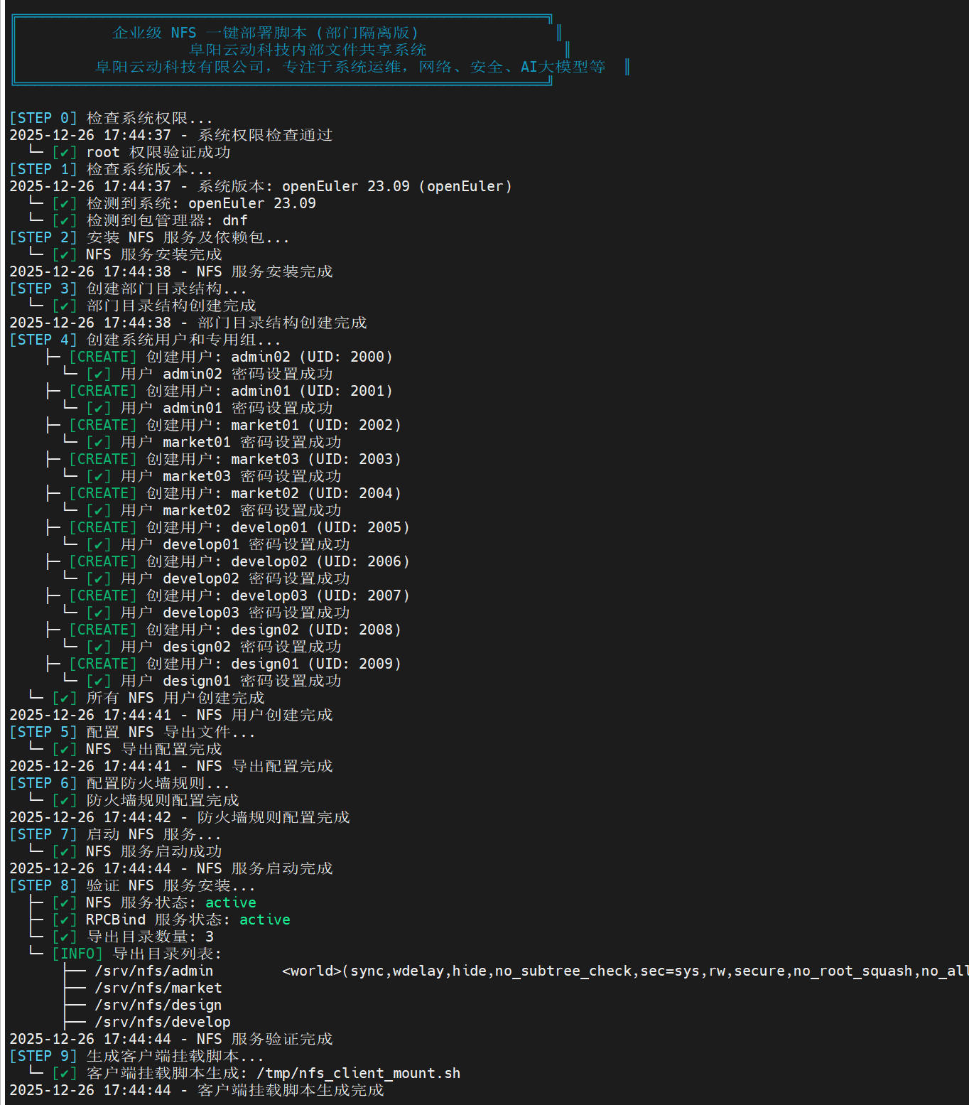 通过这款企业级NFS一键部署脚本,我们成功解决了国产化环境下的多部门文件共享难题。该方案不仅实现了开箱即用的快速部署,还通过严谨的权限隔离设计保障了数据安全。