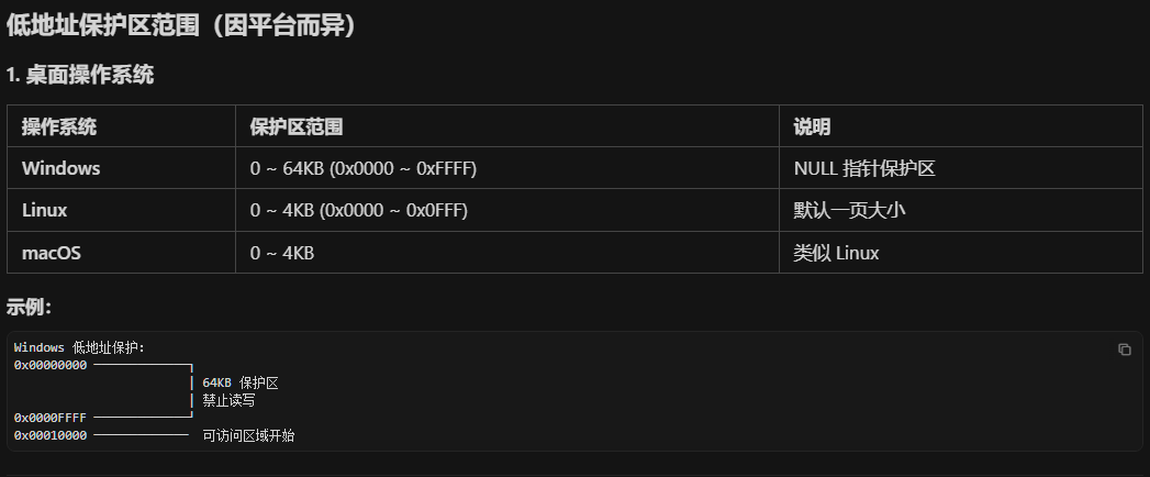 printf("%d", *p); // 报错!因为地址 10 (0x0000000A) 处于低地址保护区