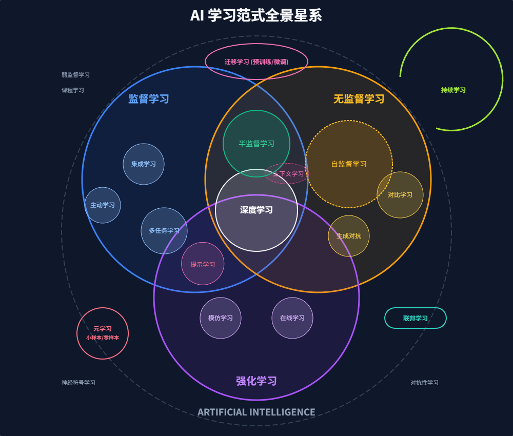 将人工智能领域所有主流的"学习"范式,按照 "核心思想 -> 关键特点 -> 典型方法" 的提纲重新整合与梳理,并按当前流行度与应用广度进行排序。