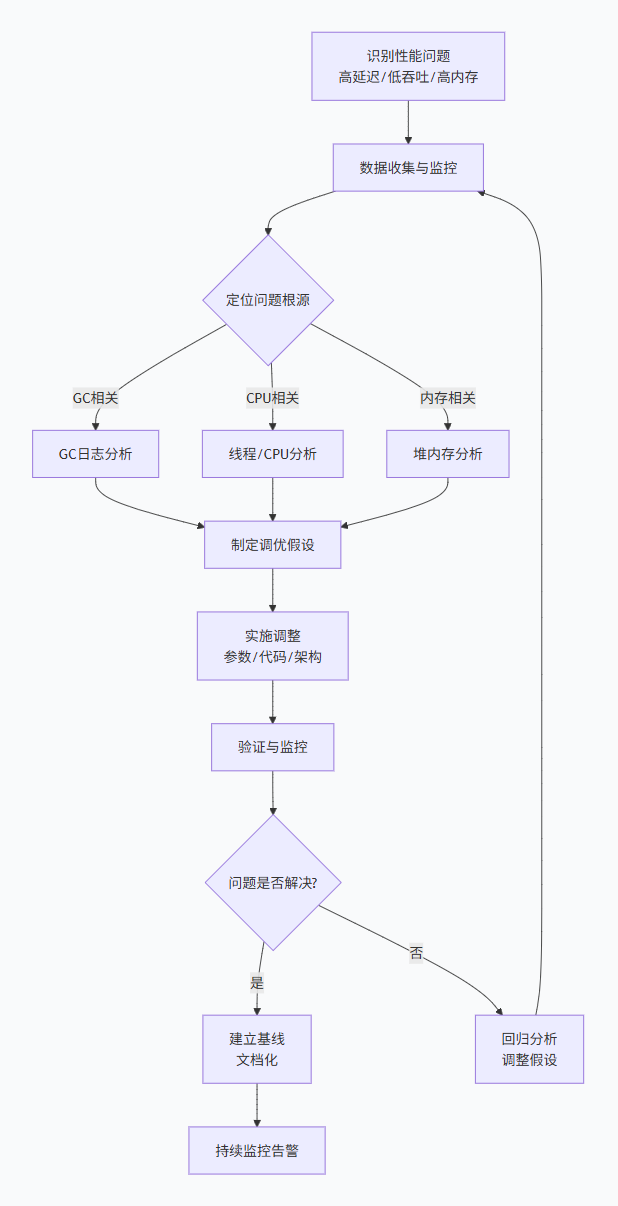 JVM调优不是"玄学",而是建立在可观测性、可实验性、可验证性基础上的系统工程。正确的调优流程遵循"测量-假设-验证"循环。