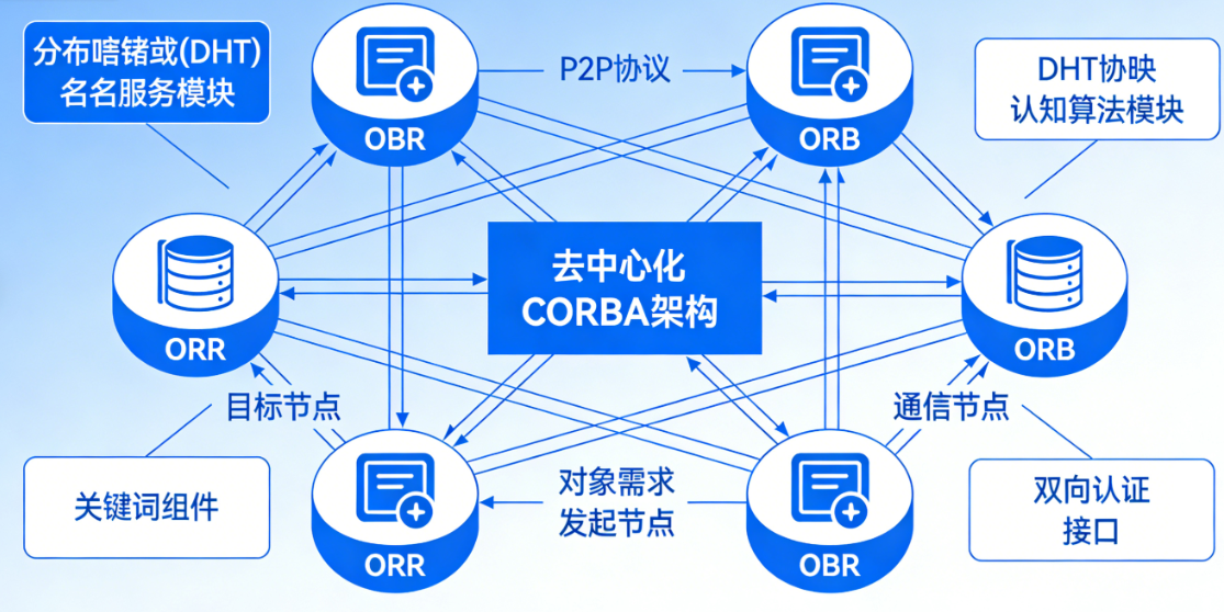 去中心化的 CORBA 架构,是对传统公共对象请求代理体系结构(CORBA)的分布式改进版本,核心是打破传统 CORBA 的集中式依赖,构建对等节点自主协作的分布式对象计算网络。它保留了 CORBA"跨语言、跨平台、面向对象" 的核心优势,同时通过架构重构解决了传统方案的单点故障、扩展性不足等问题。