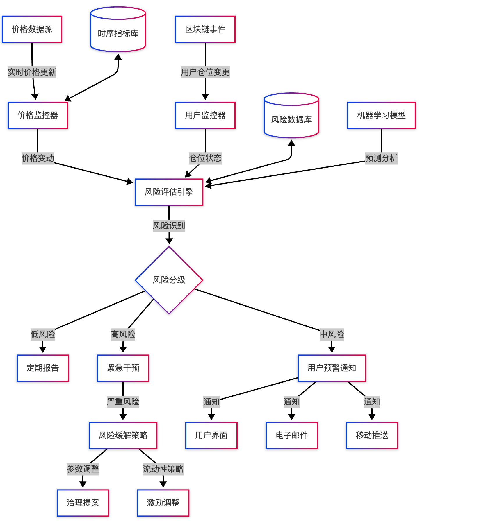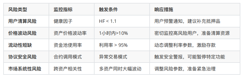 除了健康因⼦监控,Aave的⻛险监控系统还包括价格监控和趋势预测组件,⽤于提前识别市场波动可能带来的⻛险。