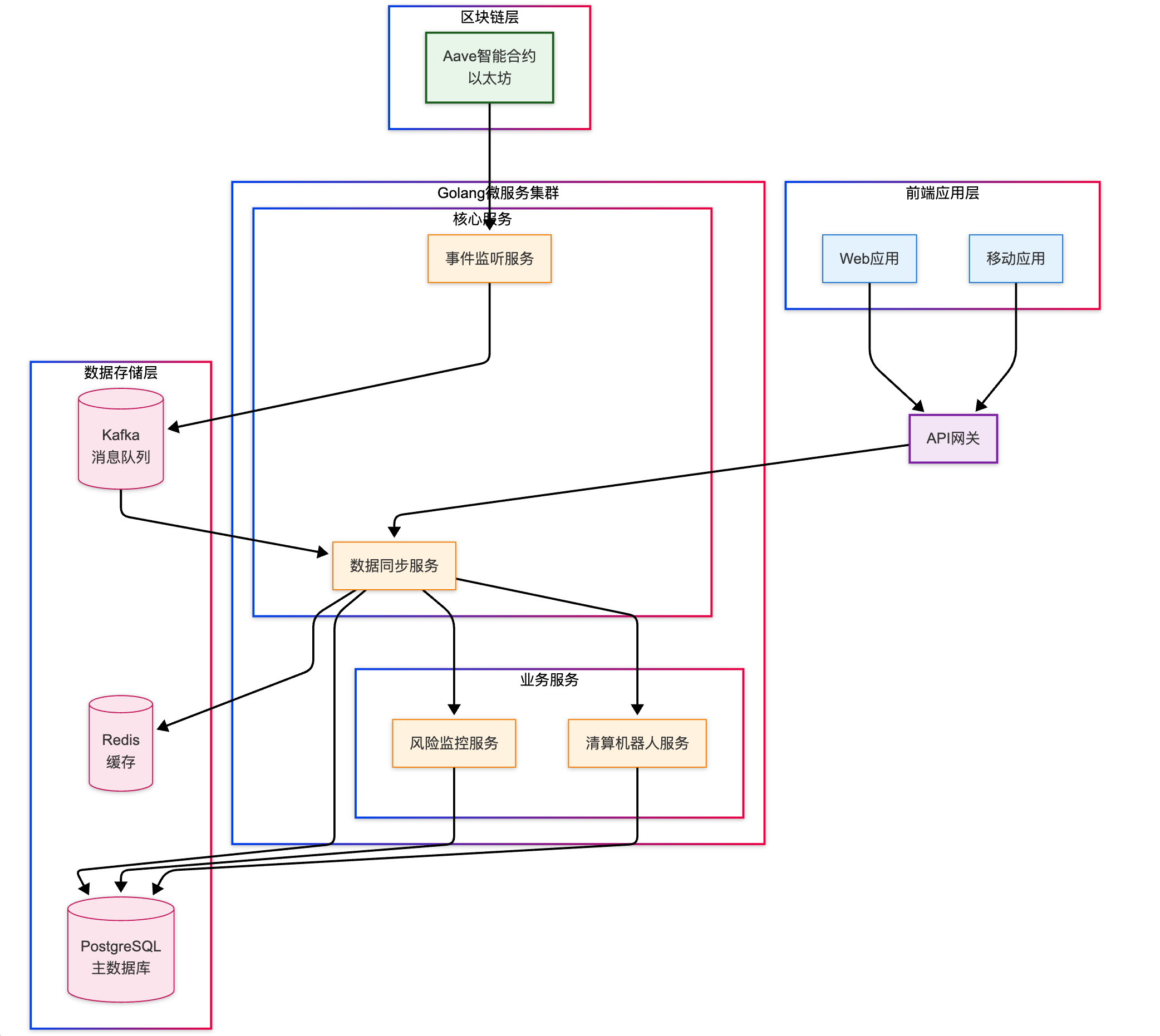 DeFi协议不仅仅是智能合约的集合,还需要强⼤的后端服务来⽀持⽤户体验、数据分析和⻛险管理。Aave协议虽然核⼼逻辑在链上实现,但其完整⽣态系统还包括⼀系列链下服务,这些服务主要使⽤Golang实现。