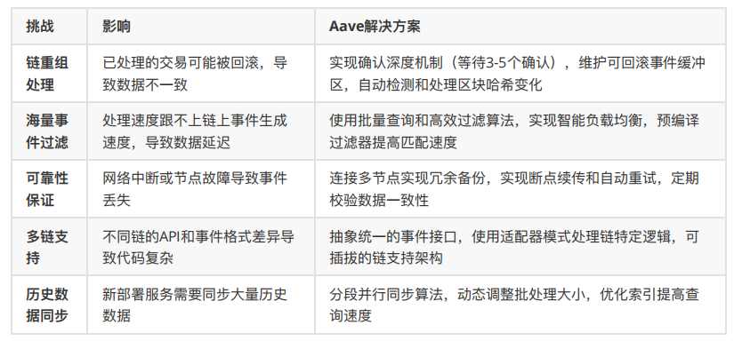 监听区块链事件看似简单,实际上⾯临诸多复杂挑战。Aave通过⼀系列技术⽅案解决了这些难题: