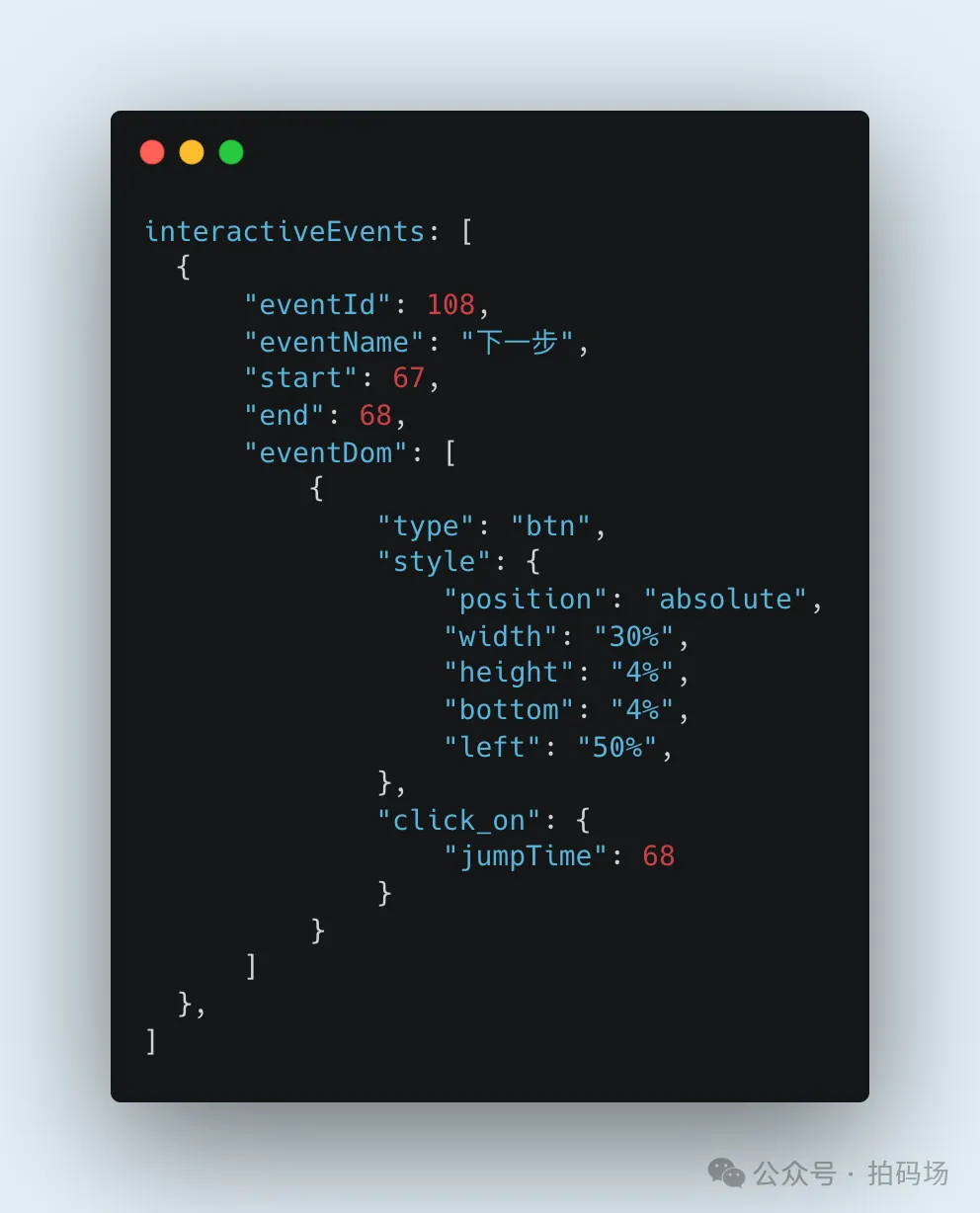 JSON 配置文件是交互逻辑的核心载体,由业务方提供交互需求(如 "00:05-00:10 显示'选择分支A'按钮,点击后跳转至视频 1 分 30 秒位置"),研发同学将其转化为标准化 JSON 格式,包含以下核心字段: