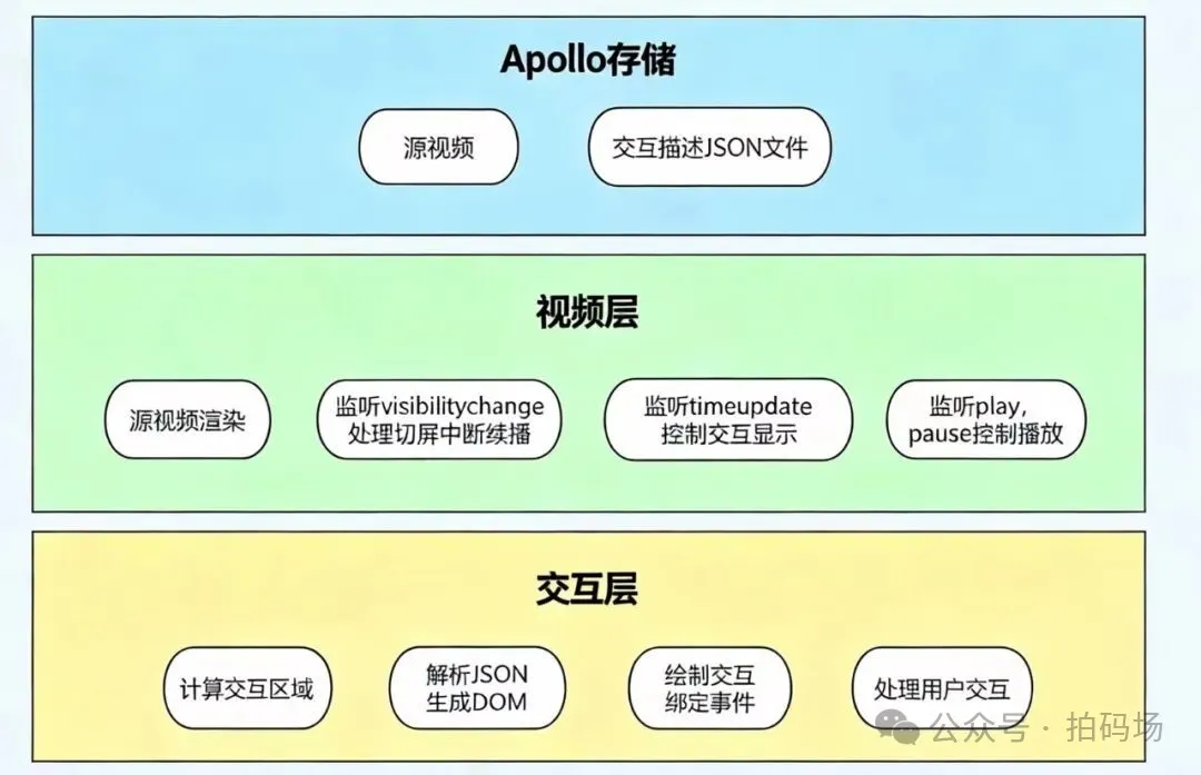 **云端托管:**视频资源与交互 JSON 配置统一托管于 Apollo 配置中心,支持动态更新,无需前端发版即可完成交互节点的修改与迭代。