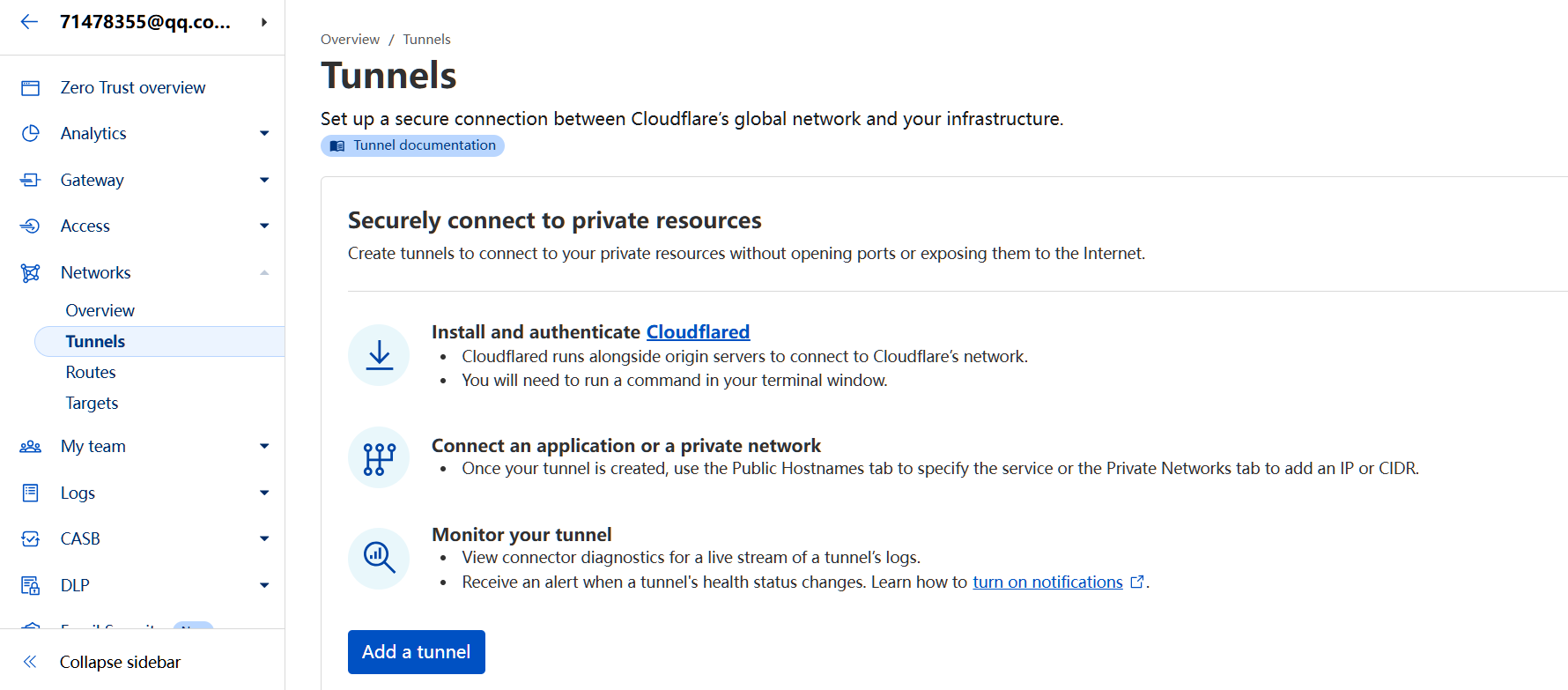 1、登录Cloudflarea官网在Zero Trust模块选择Networks,在该栏目中选择Tunnels,点击创建Tunnels。界面如下