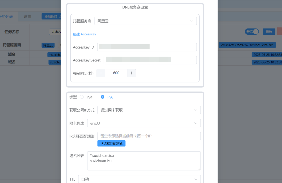 1、在lucky管理页面中的动态域名 解析中去添加任务。任务名称随意填写,任务开关和操作模式默认即可。在DNS服务商设置中,选择你域名所属的服务商。并点击创建AccessKey根据提示去创建,创建完成后填写AccessKey ID 和AccessKey Secret 栏目。类型选择IPV6 ,获取公网方式选择通过网卡获取如下,在域名列表中填写匹配的域名信息。*.suxichuan.icu这个域名表示匹配这个域名下的所有子域名。然后点击添加任务按钮。