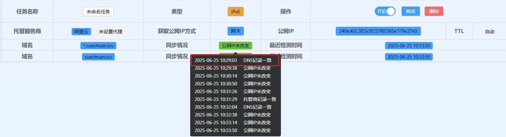 2、添加成功完成后,在任务列表在IPV6的栏目中可以看到dns信息与记录值一致。表示配置完成了,两个项都可以查看配置成功。