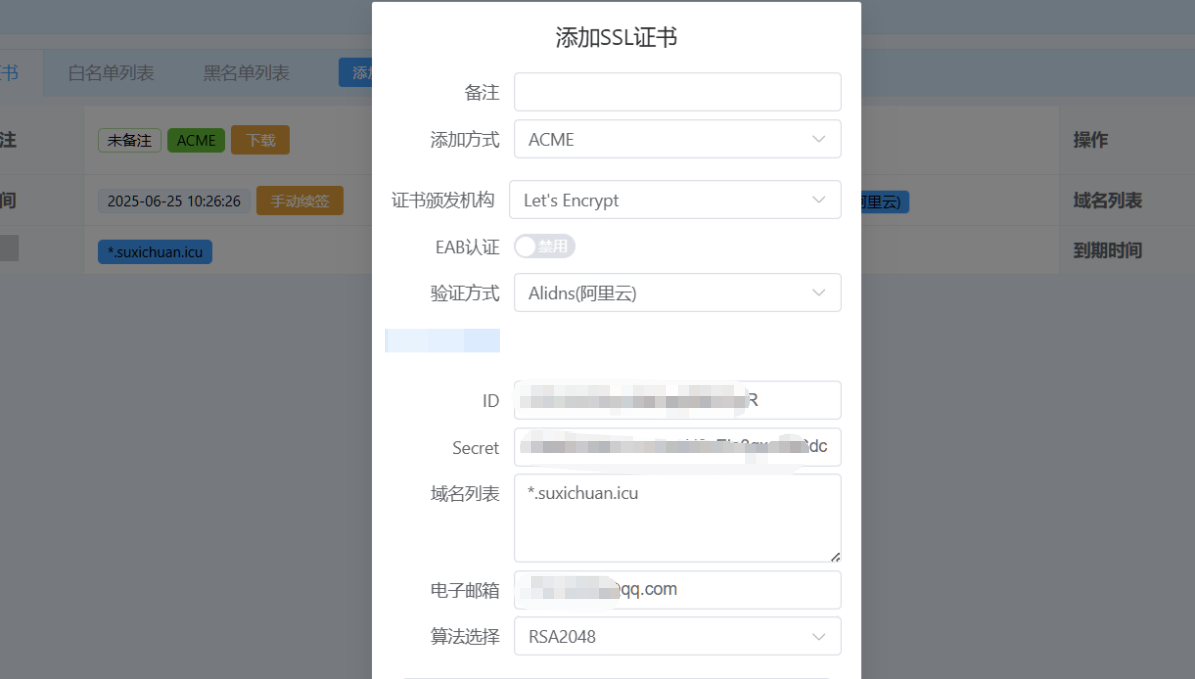 4、在安全管理 中去添加证书。添加方式勾选:ACME ,证书的颁发机构选择:Let's Encrypt ,验证方式选择阿里云 。这里同样是需要填写阿里云的AccessKey ID 和AccessKey Secret 栏目的,根据上面添加任务一样填写,更多设置 栏目和代理设置栏目默认即可。稍等片刻证书就是生成成功如下图