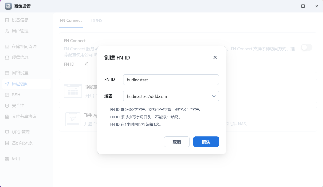 2、在系统设置的远程访问中开启FN Connect,开启时会让你填写FN ID,其实就是子域名,如下。等待一会证书申请完毕后就开启了远程访问功能了。