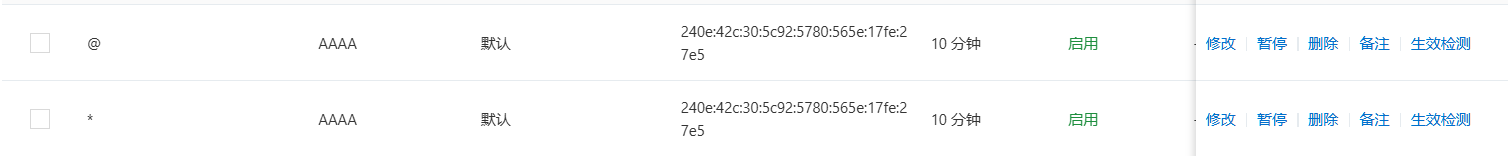 3、这时候在阿里云的域名解析中就可以看到两条指向IPV6的信息如下,其实就是lucky通过AccessKey去创建的。当然你也可以直接通过手动添加的方式去添加域名解析的记录值。IPV6的地址可以直接在系统设置的网络设置中看到。