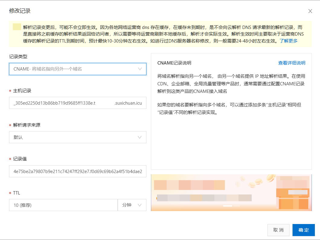 在域名解析模块去添加一条记录,如下,然后在验证模块点击验证即可,验证完毕就可以下载证书了。