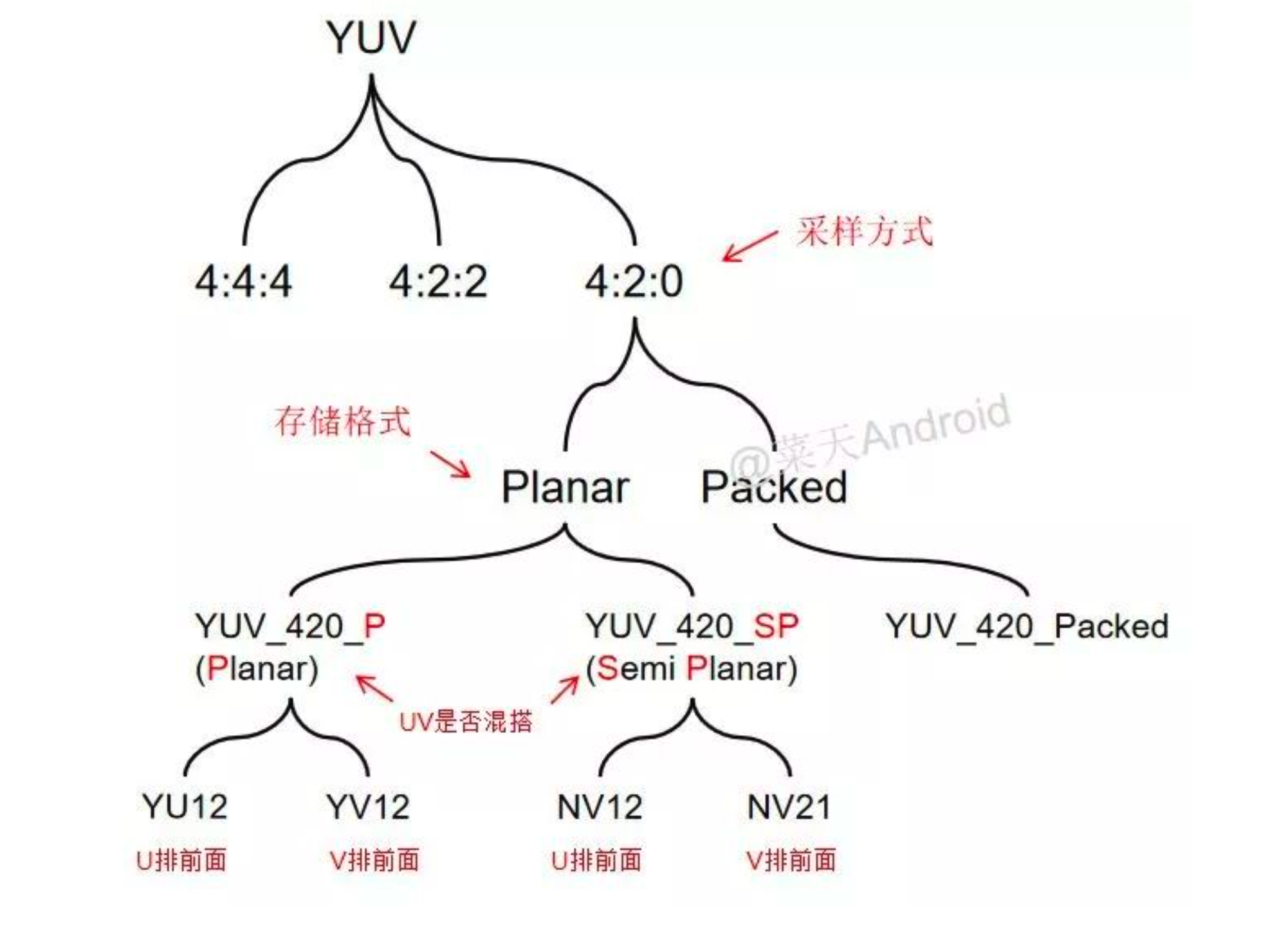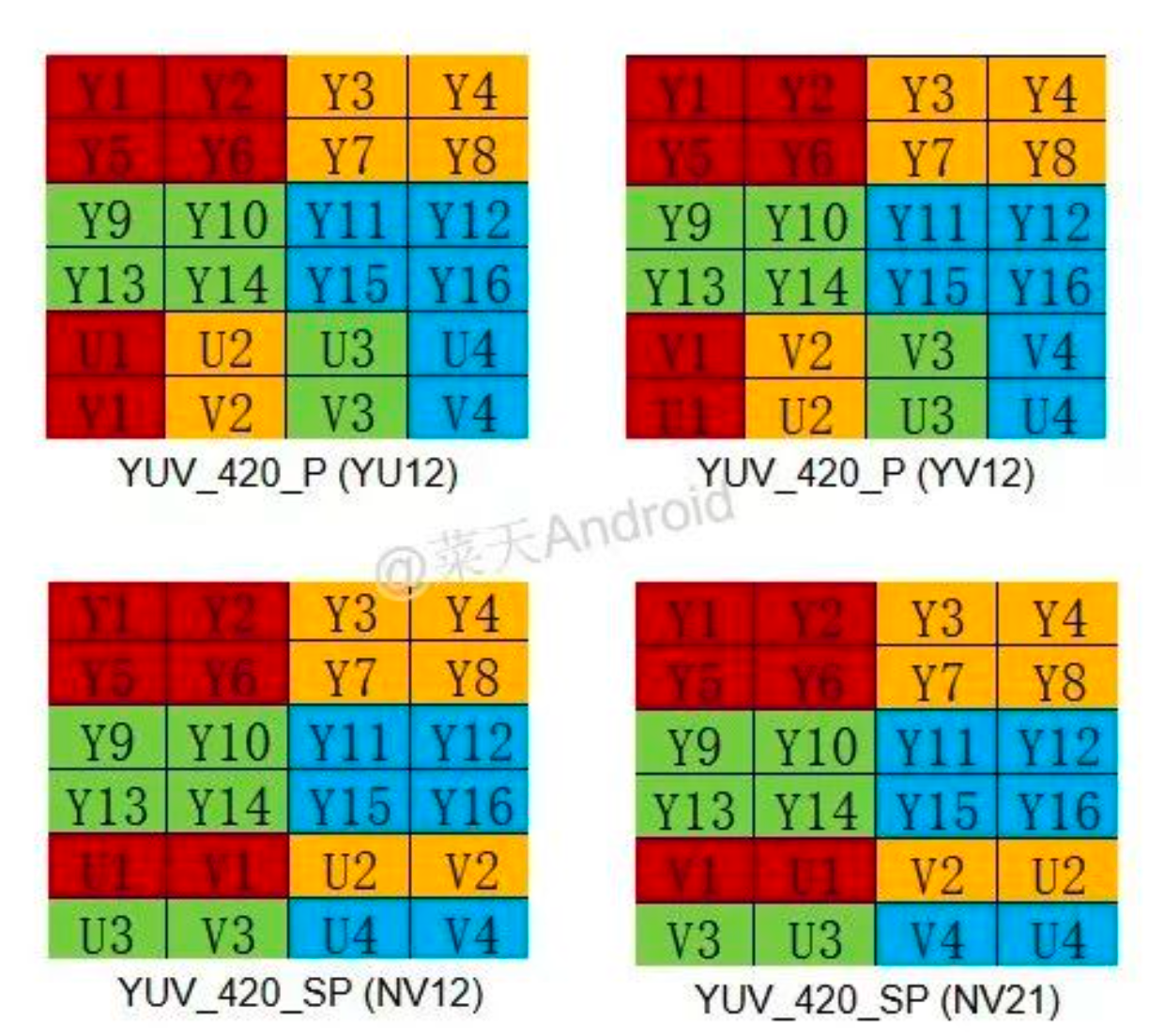 从大的分类上讲, 有的多了个 S, 你看这个 YUV_420_P 和 YUV_420_SP, 这里面就多了个"S", S 代表的是,UV是否混搭。那么这样的话我们进行理解一下