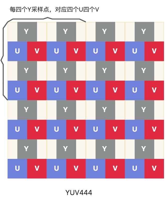 YUV444,代表每4个Y采样,就有对应的4个U和4个V。