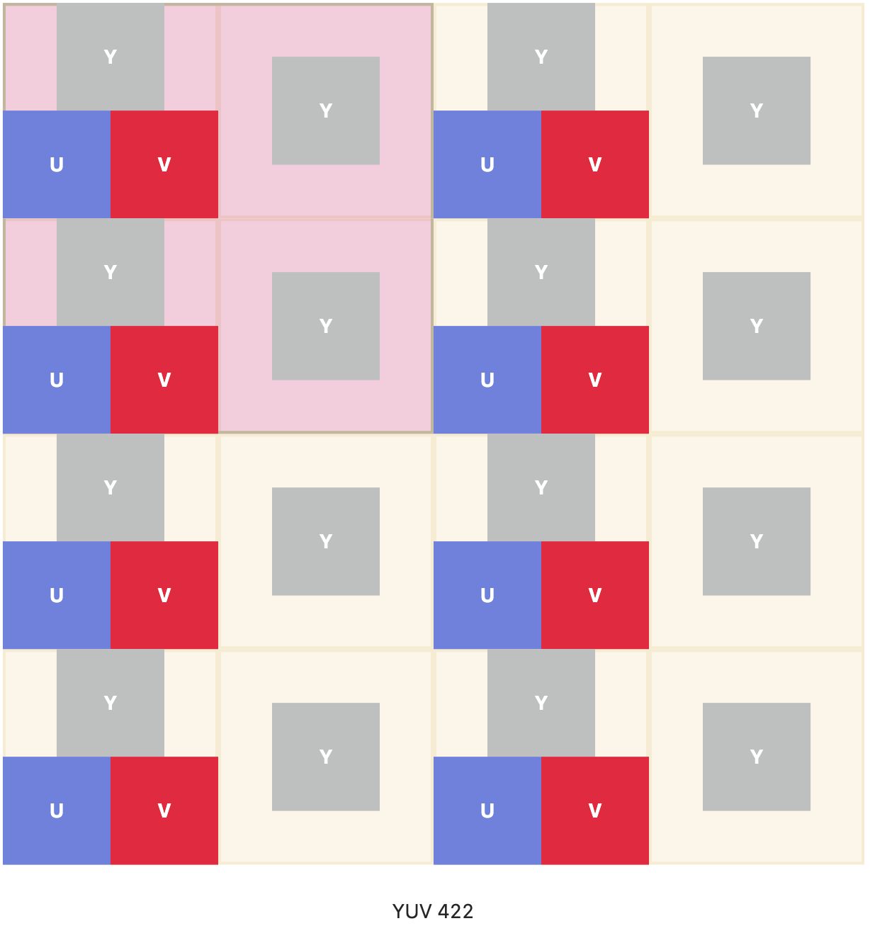 YUV422 就很明显,把UV的量给减少了,相比于444,它只保留了一半。隔一个保留一份全的。