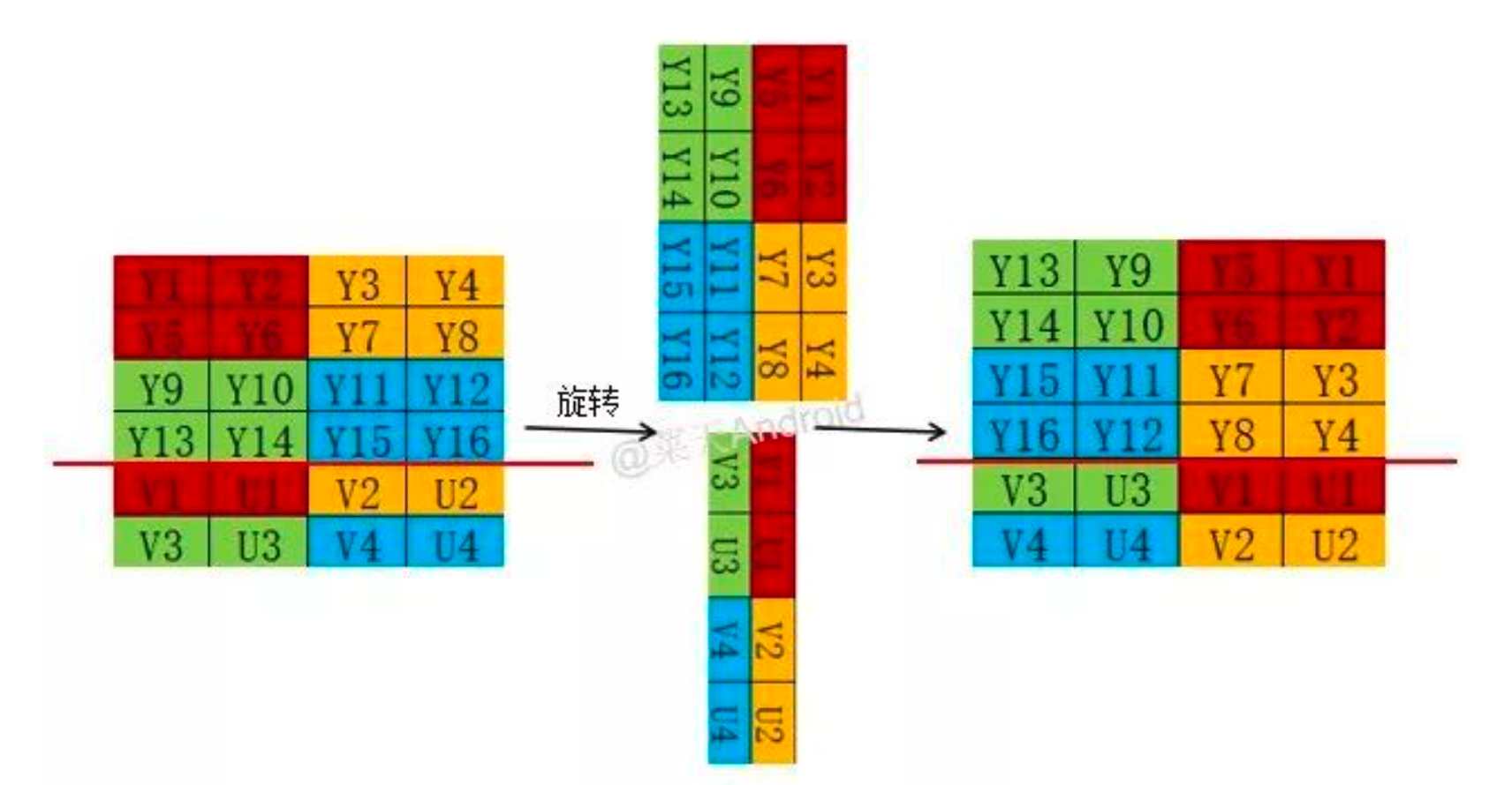 正确的思路是: 把YUV拆开,分别转90度,然后再拼接。原因简单啊,Y U V 数据,实际上内容展现的都是一整张图片的颜色分量。分开转方向,实际上就是将Y分量全转,U分量全转, V分量全转。都转对了,就是一个可以看的图片,转错了,勉强能看出是啥。但是图片不正常。