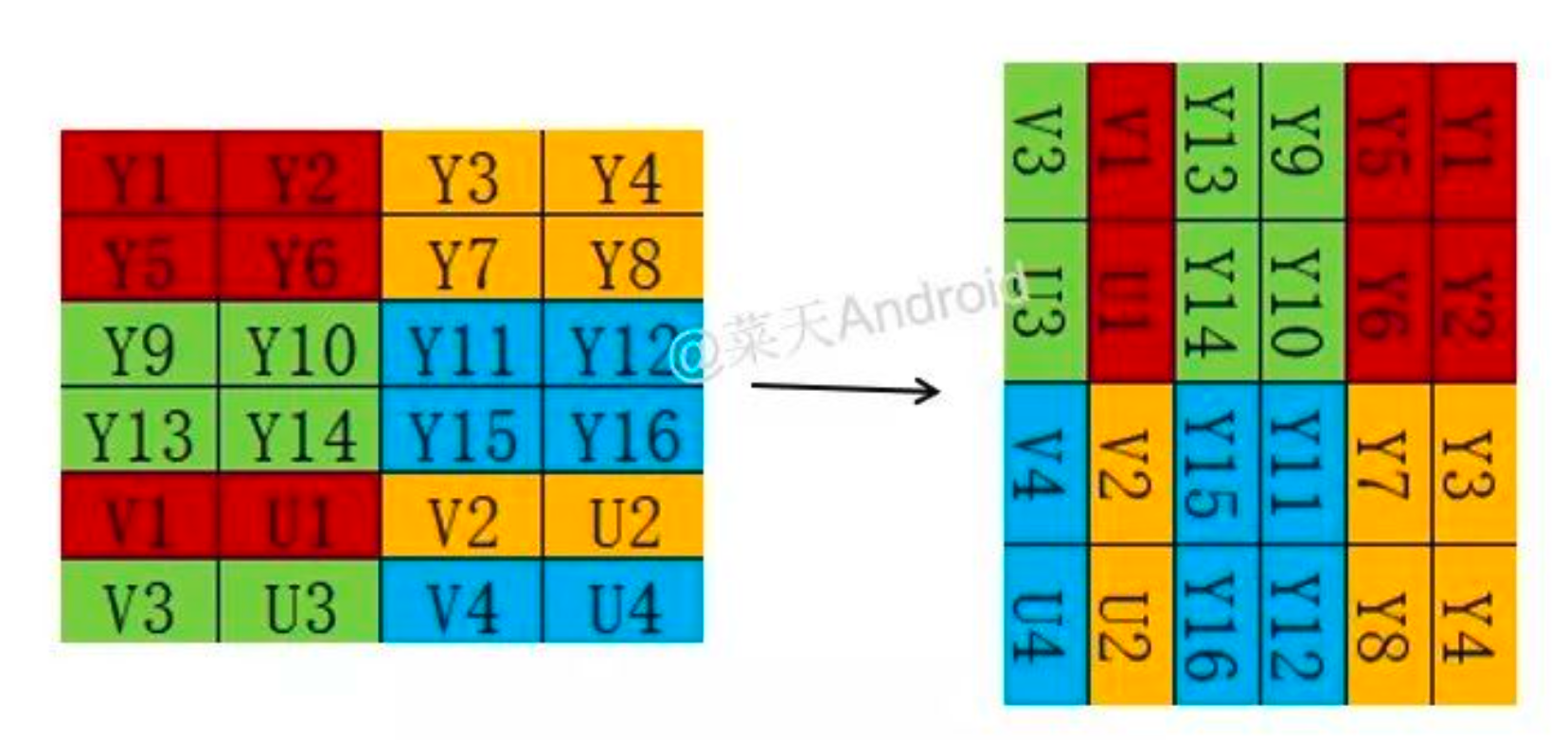 形式上也是那种套路,每四个Y采样点,有两个U,两个V