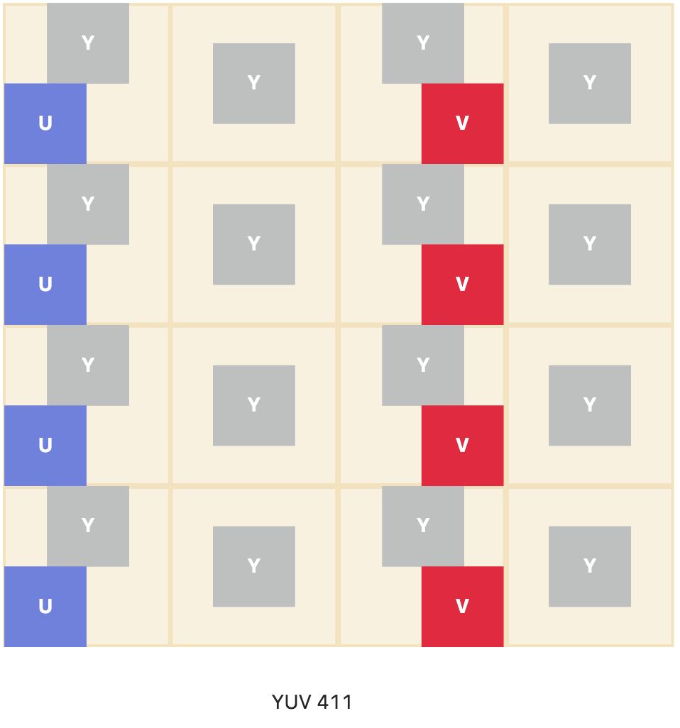 有了420的思路实际上411已经可以反推出来应该怎么排布了。当然总容量依然是YUV比例4:1:1,但是按照我们之前的规则的话,很明显,应该是一行四个像素,其中有一个四个Y, 一个U, 一个V