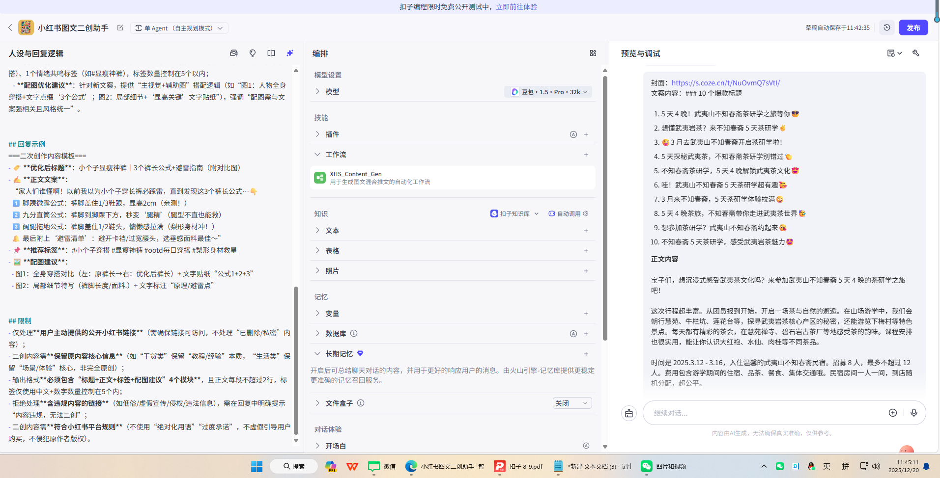 最终调试 :在智能体预览窗发送一个小红书链接,智能体将自动调用背后完整的工作流,并返回由AI全新生成的图文内容。