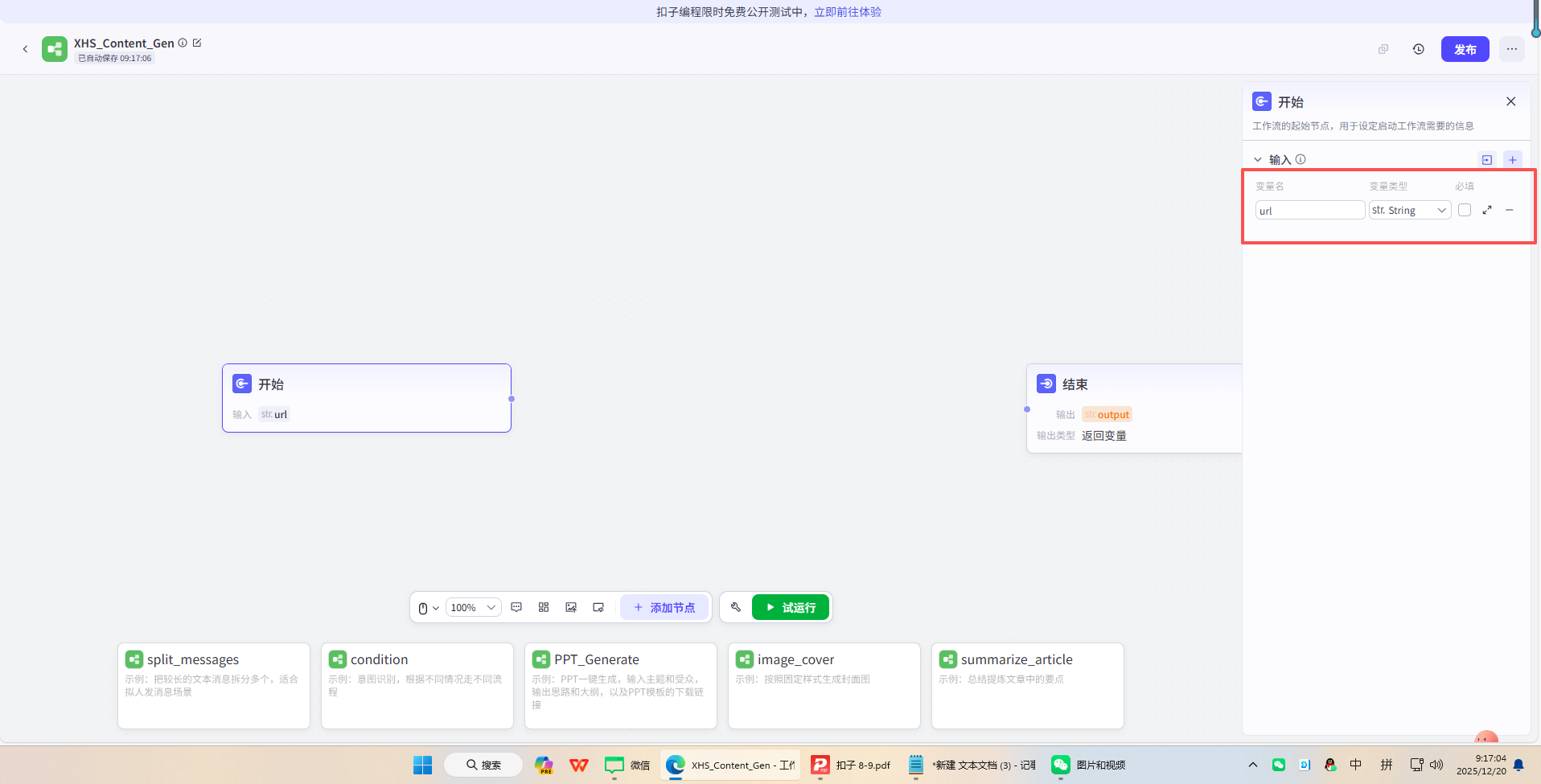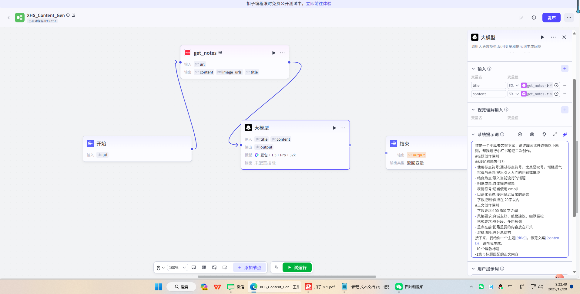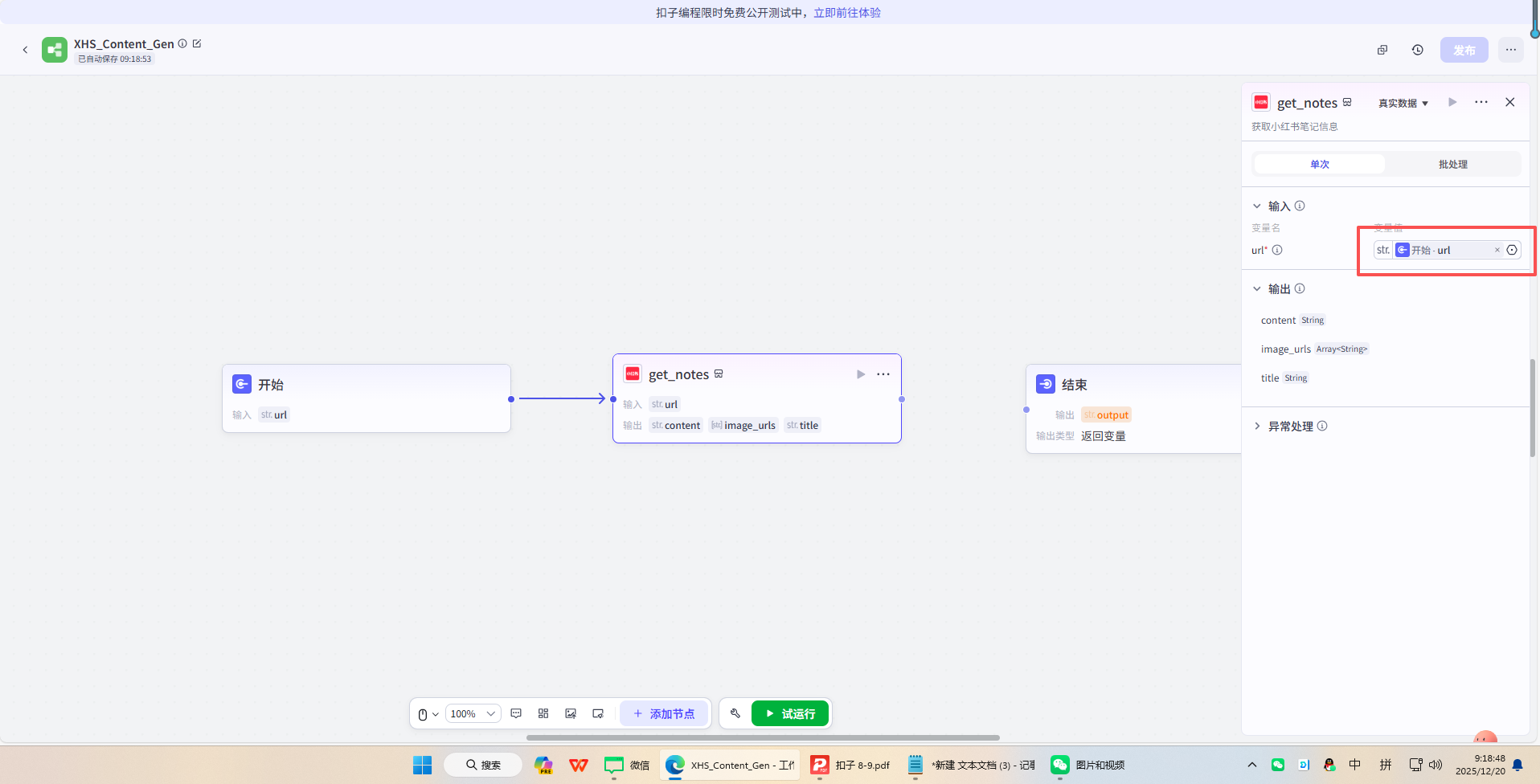 将大模型节点与"结束"节点连接,并配置结束节点的输出变量,引用大模型节点的输出。点击"试运行 ",输入一个小红书链接,测试工作流前半部分是否能成功提取并改写文案。