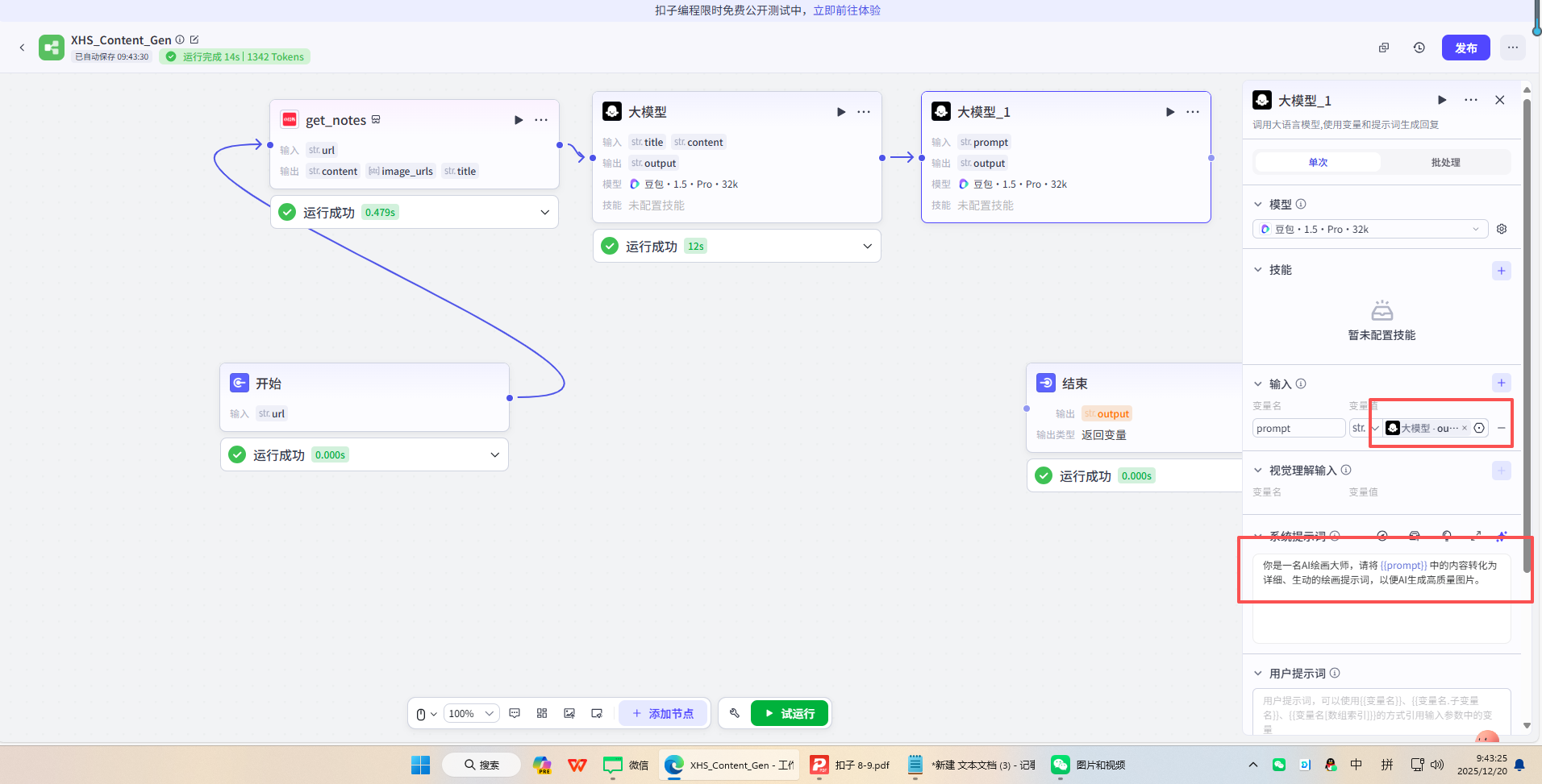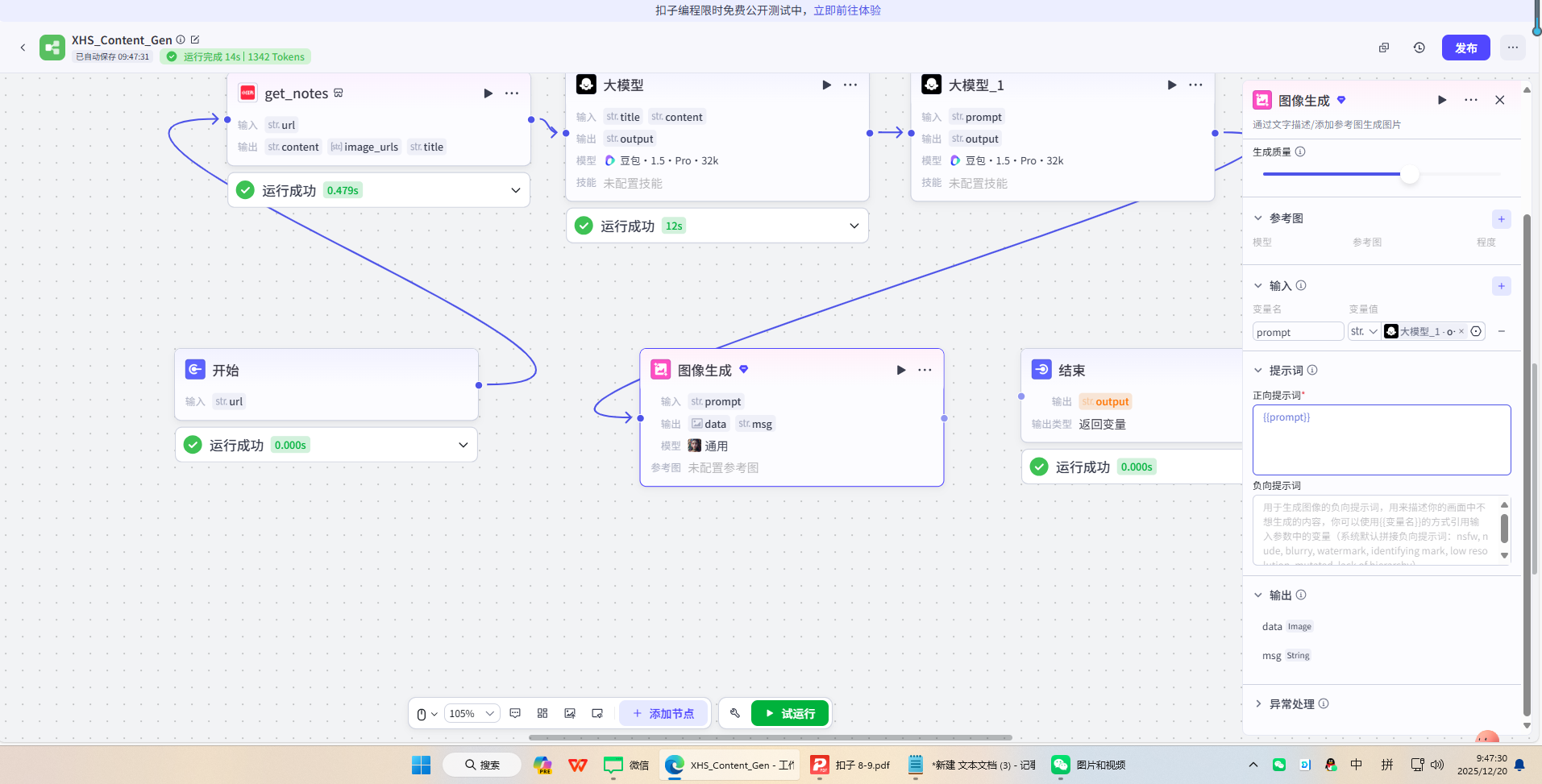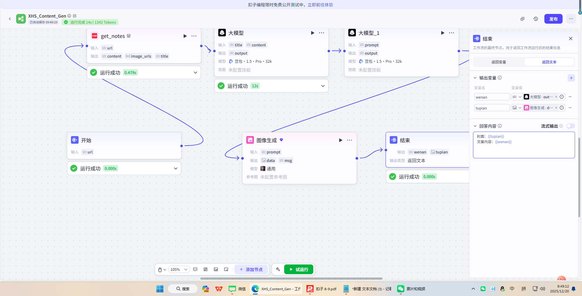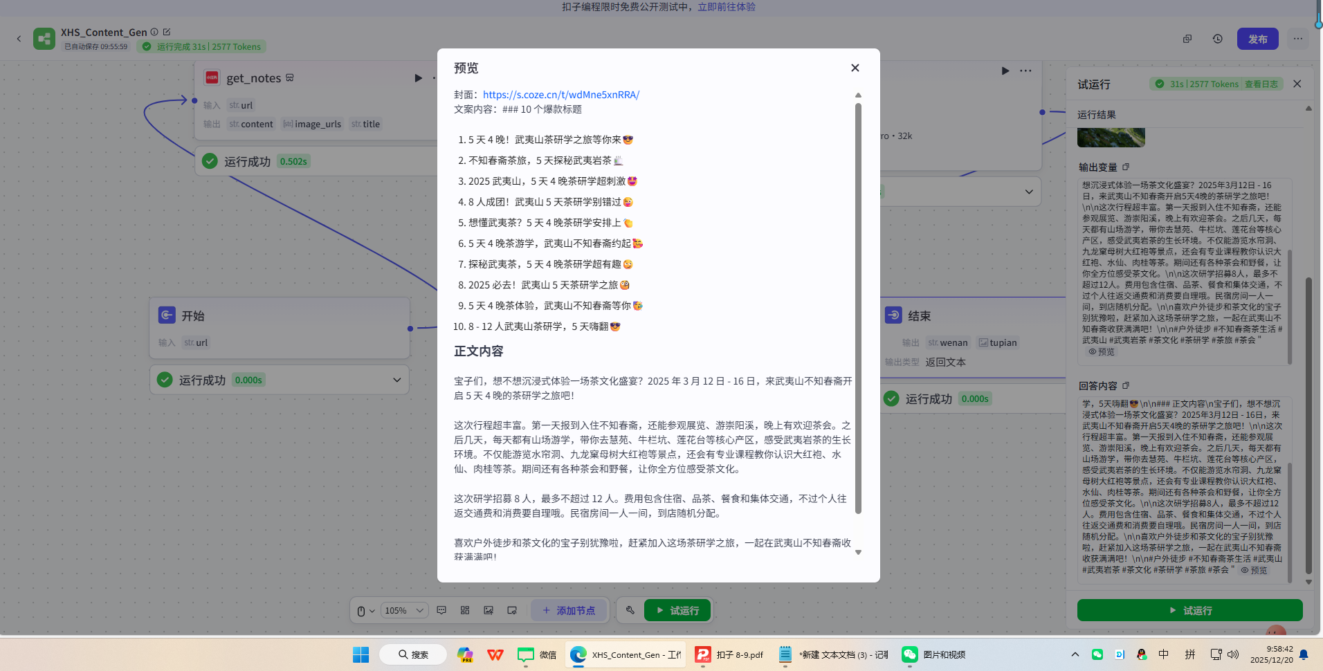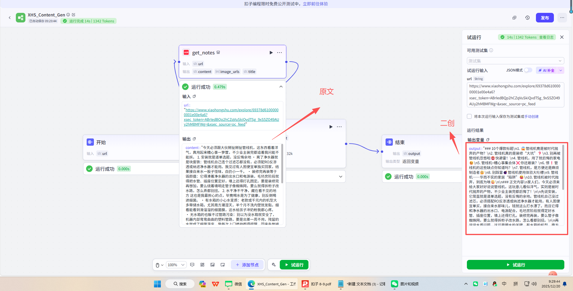 点击"试运行",输入链接,观察每个节点的执行状态(绿色表示成功)。最终应获得生成的新文案和配图。