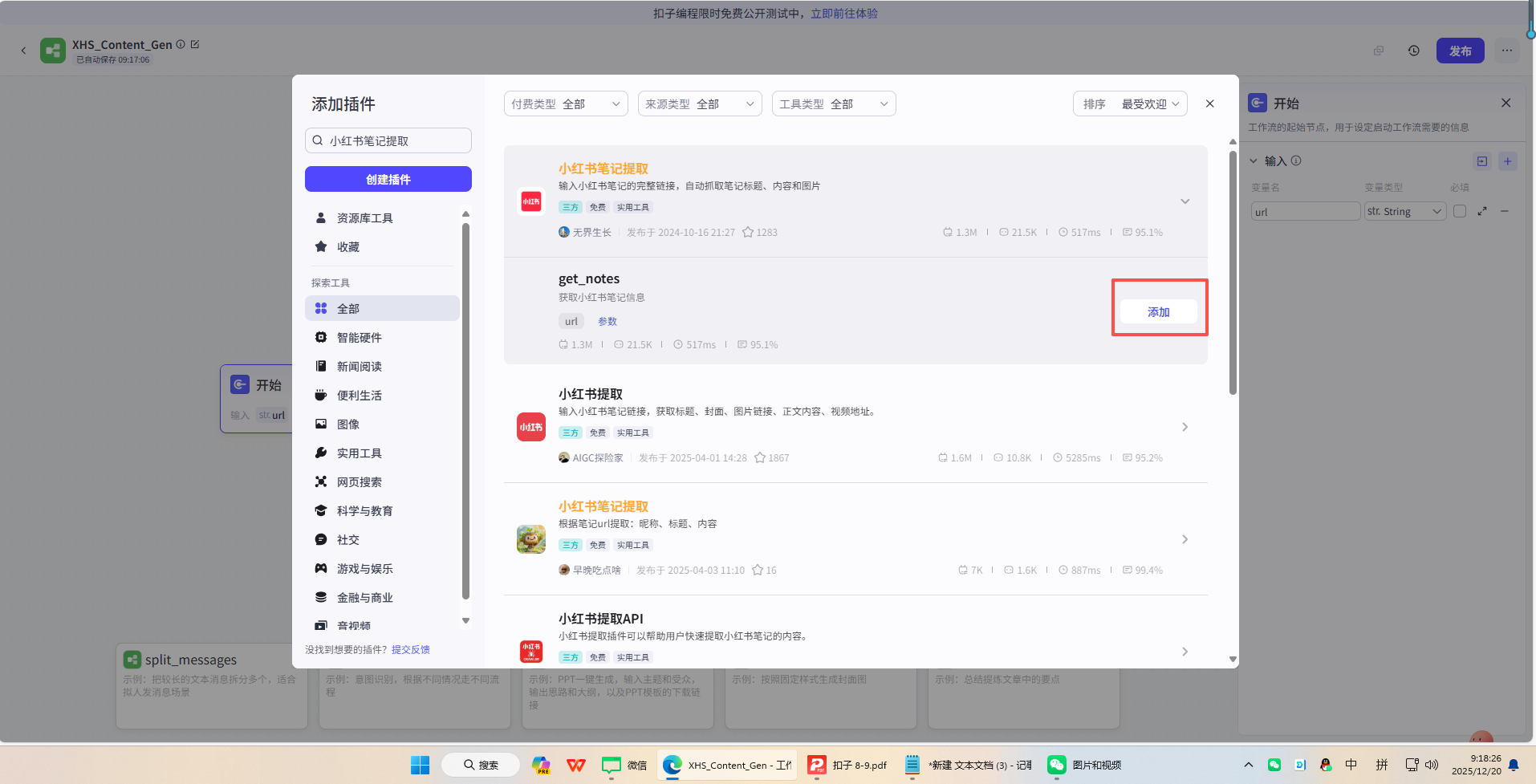 在工作流中添加"插件 "节点,搜索并添加"小红书笔记提取"类插件(例如 get_notes)。将开始节点与此插件节点连接,并配置插件节点的 url 参数,引用开始节点的 url 变量值。
