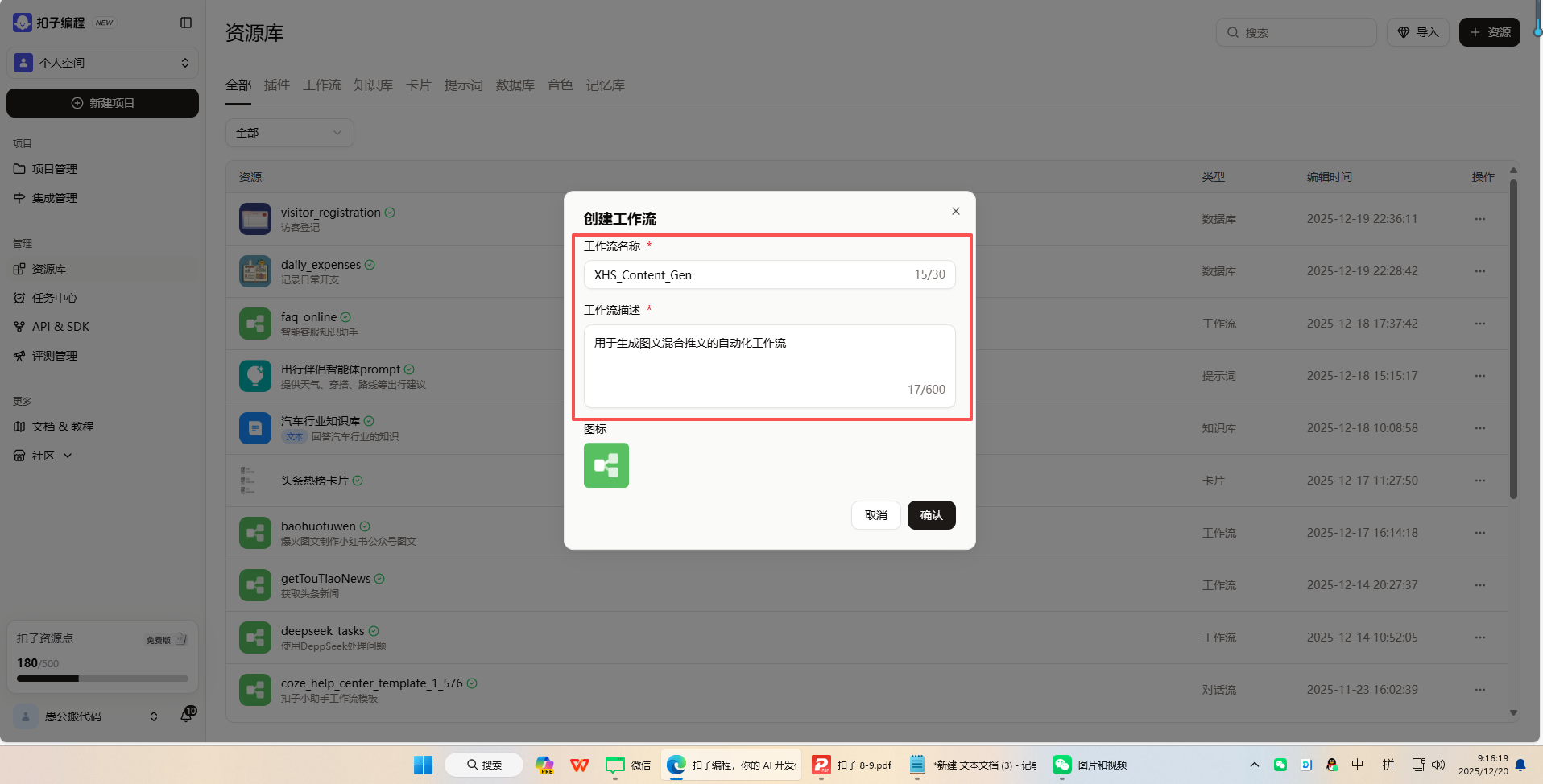 进入扣子平台"资源库",点击"+资源"选择"工作流 "。创建时需注意:工作流名称需使用英文、数字或下划线(如 XHS_Content_Gen),描述可填写"用于生成图文混合推文的自动化工作流"。创建后,编辑界面将默认包含"开始"和"结束"两个节点。