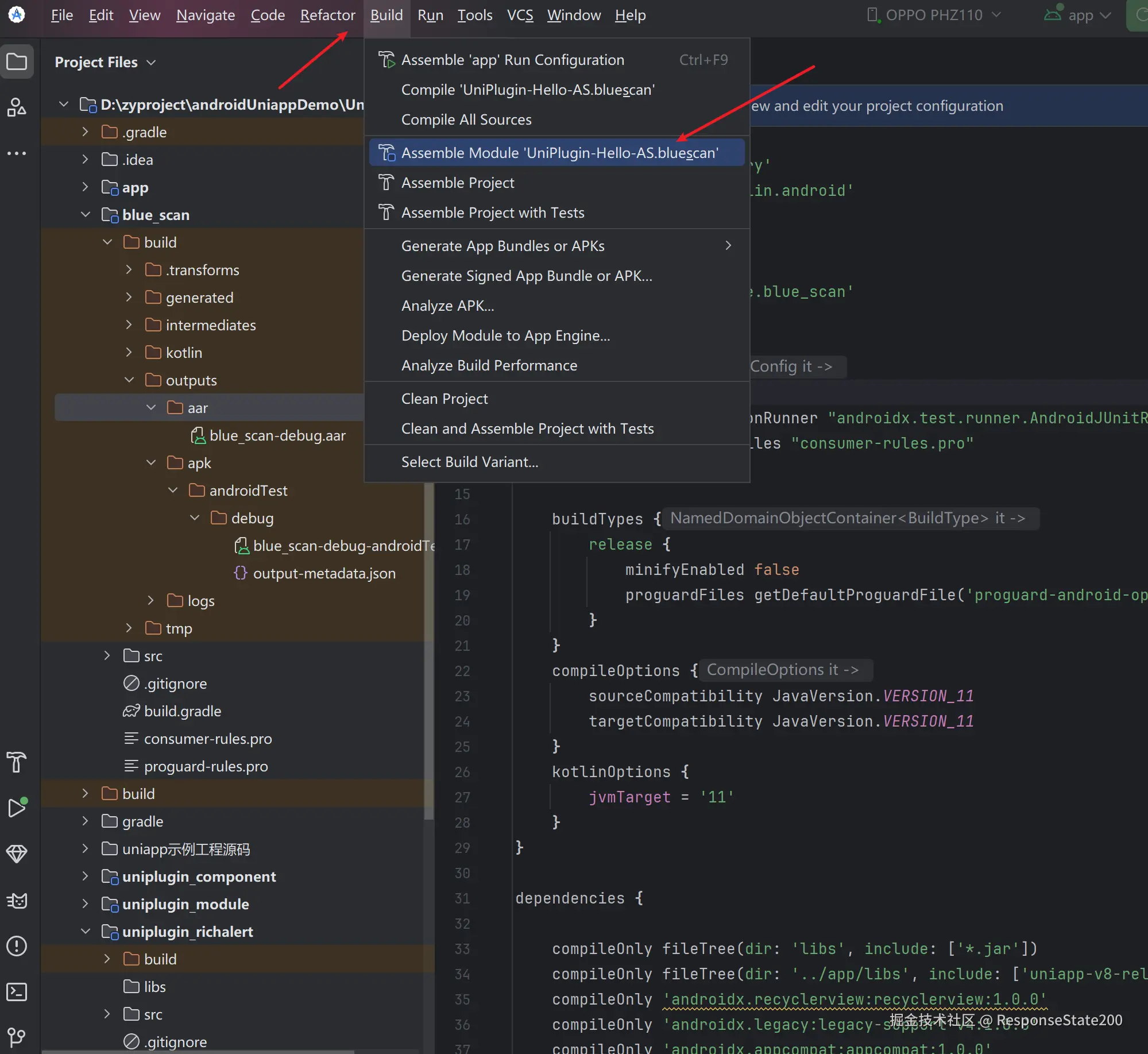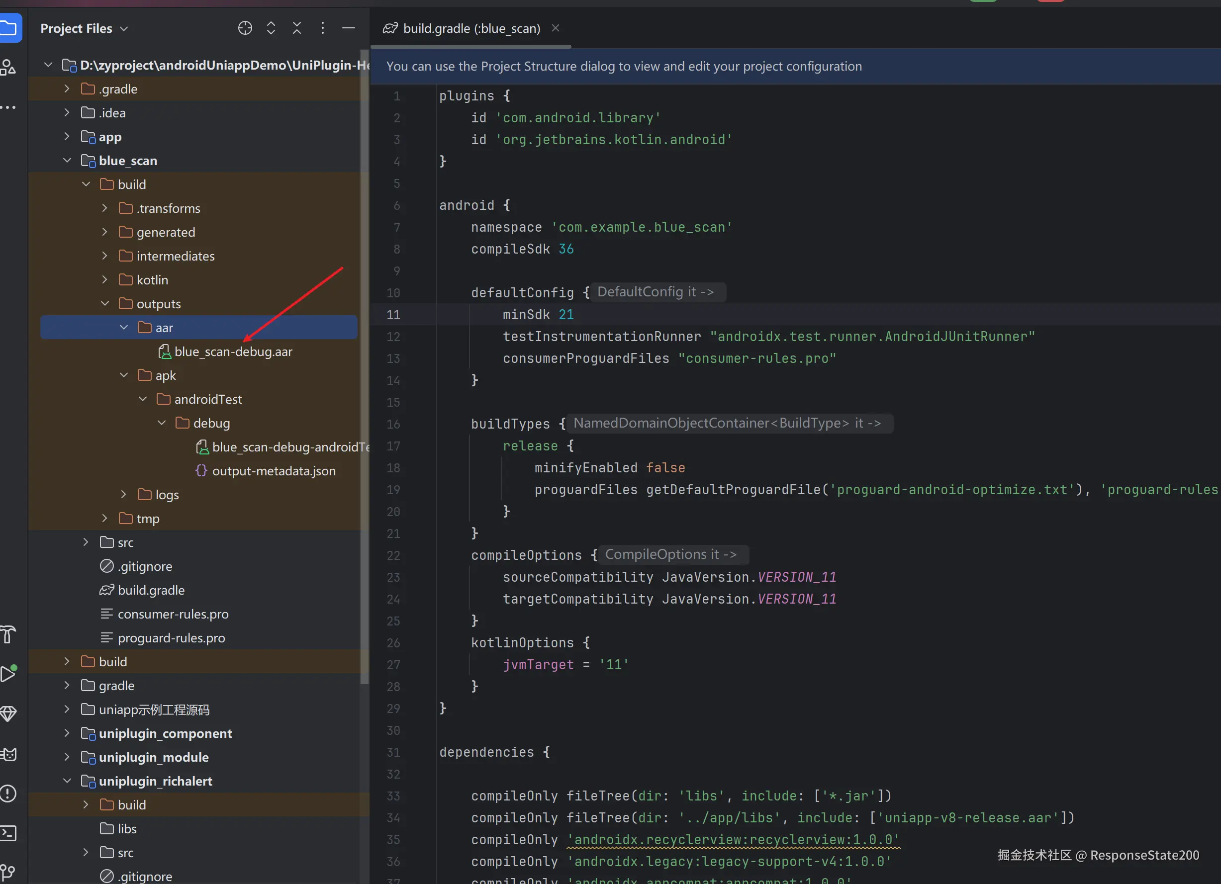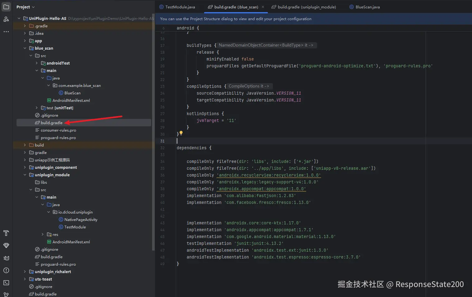 在模块的build.gradle 依赖文件上加上插件编写必要的依赖包,我们可以选择直接从uniplugin_module 下的build.gradle 中的dependencies 依赖项拷贝过来,所以我们模块的build.gradle 下的dependencies就应该变成下面的样子。