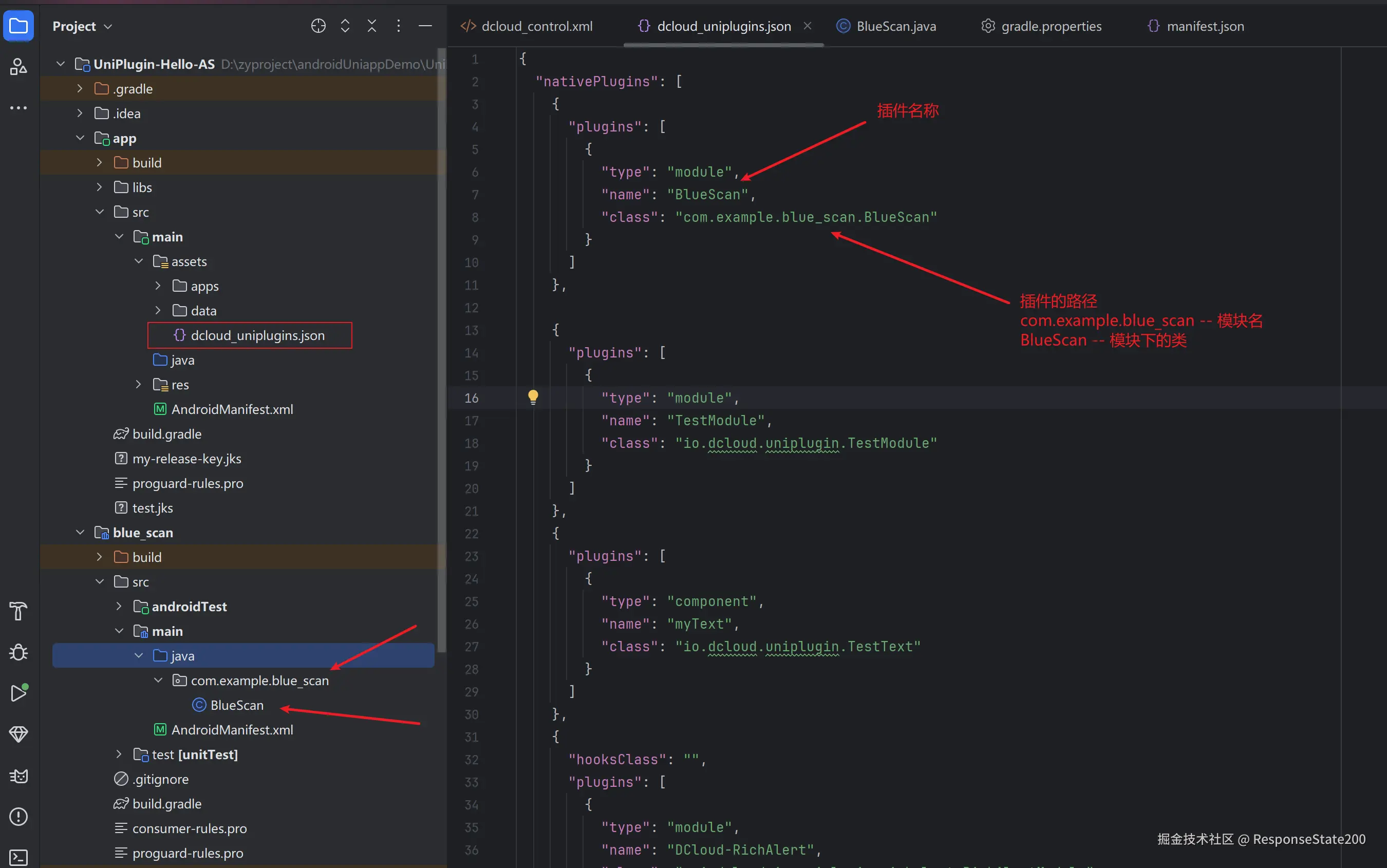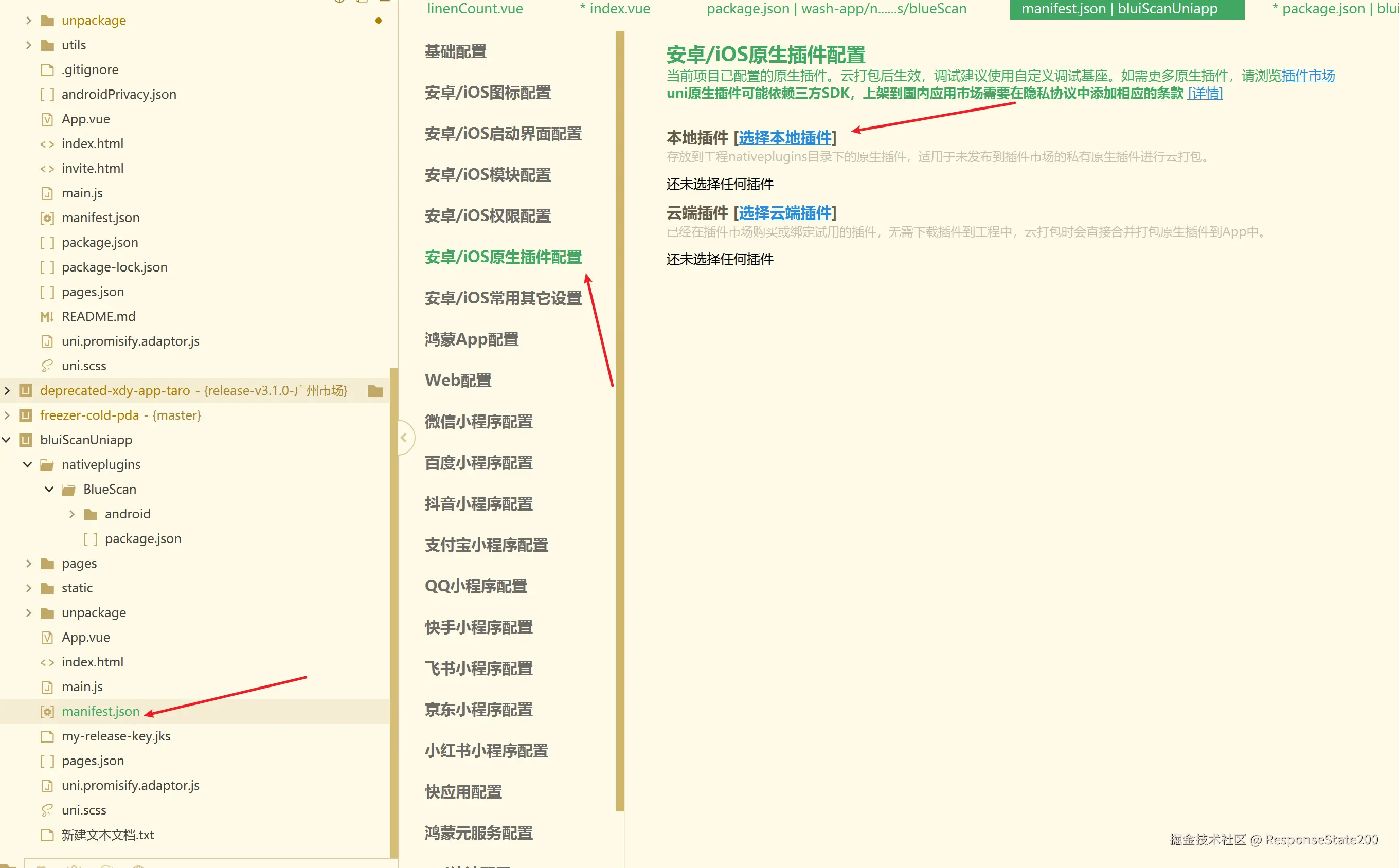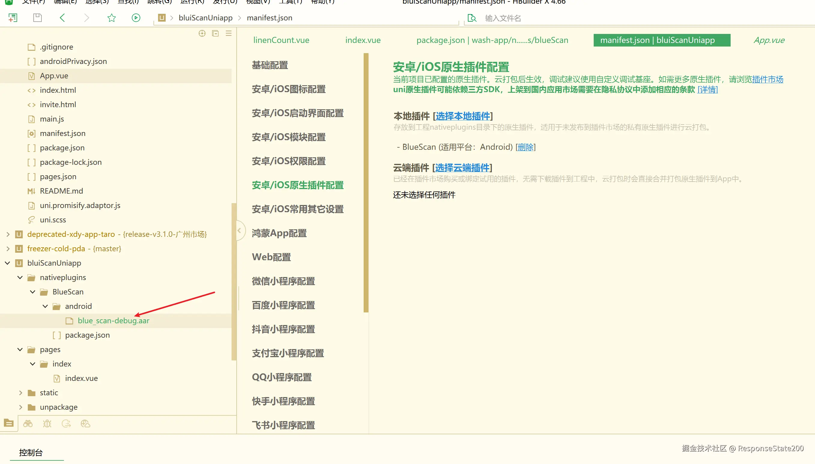 在uniapp项目中新建一个nativeplugins的文件夹,这个名称是固定的,存放安卓插件内容。在这个目录下新建一个目录插件的名称,我们就叫BlueScan,在下面新建一个package.json。