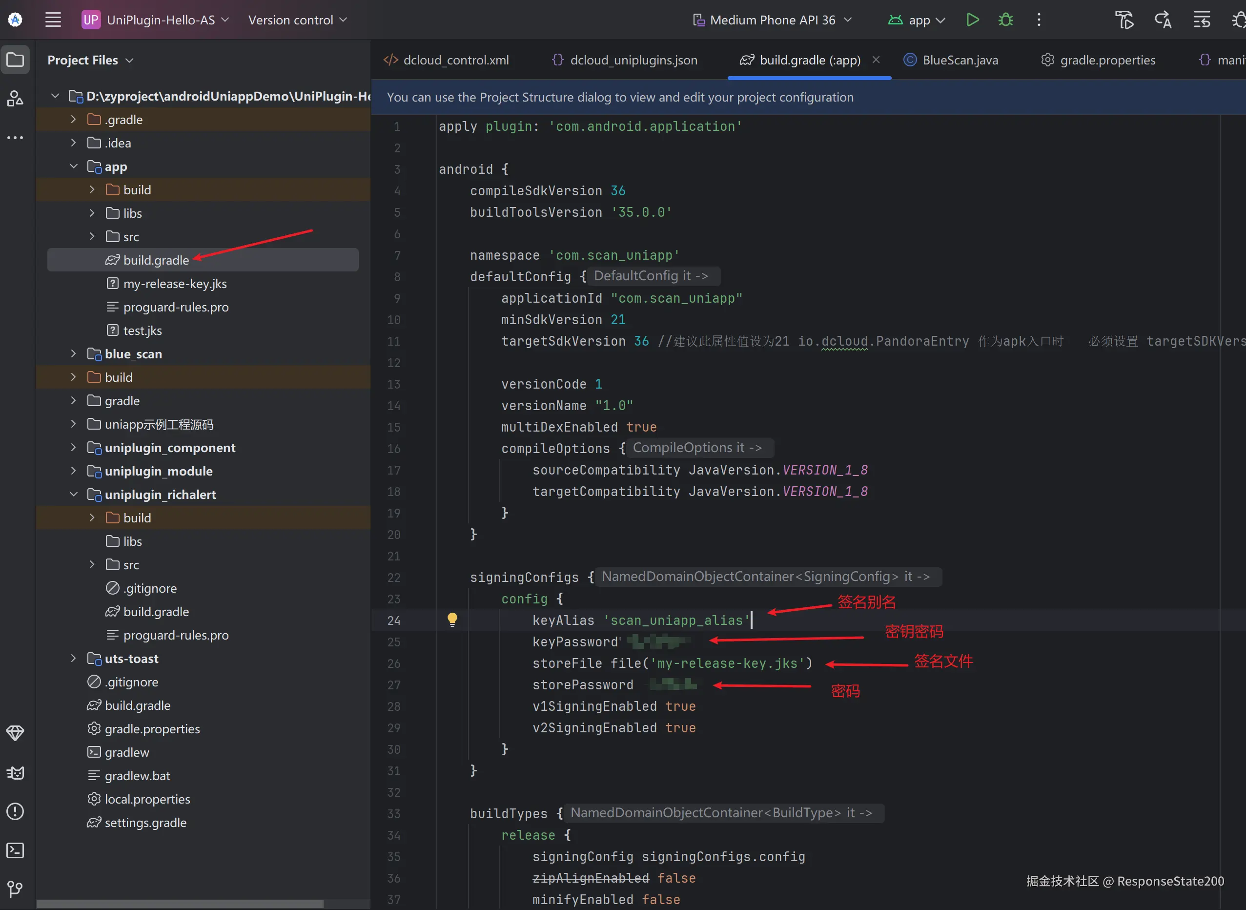把安卓的签名文件放到安卓项目中的app文件夹的根目录上,并填写对应的签名配置