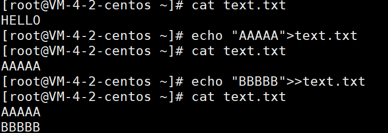 输出重定向:>hello.c 每次写入都是从头开始,并且将原来的内容清空,从头写入;