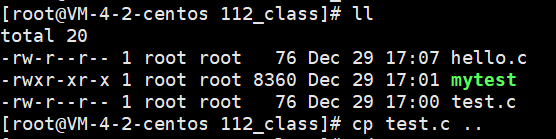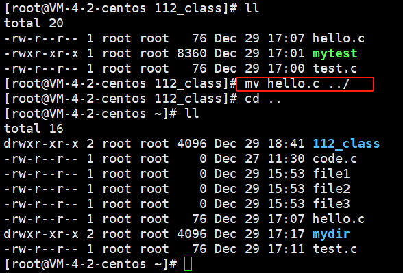 ②剪切文件目录;下图的hello.c本来是在112_class文件中,但是使用命令 mv hello.c ../ ,也就是将hello.c文件移动到了其上级目录;