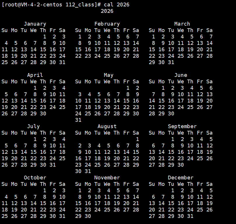cal 2026 :在命令行显示任意年份的日期,早期因为用linux的时候程序员没法看时间用的,现在大家都有手机了,就用不到了;
