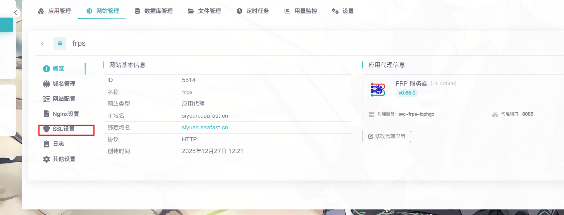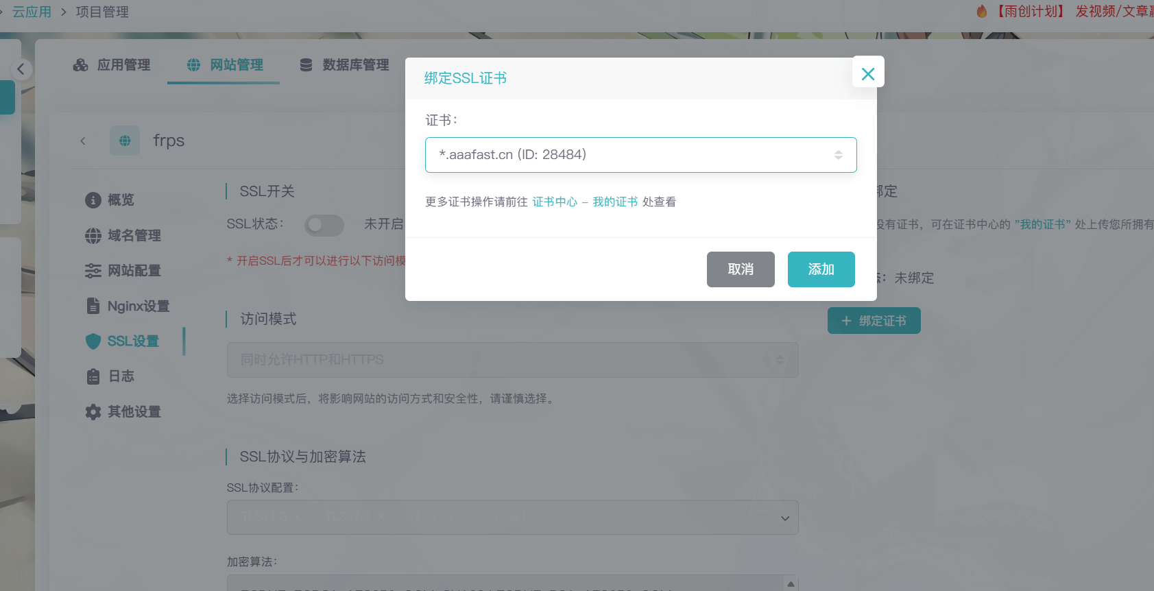 然后去云应用的网站管理绑定SSL证书,绑定后会自动开启SSL
