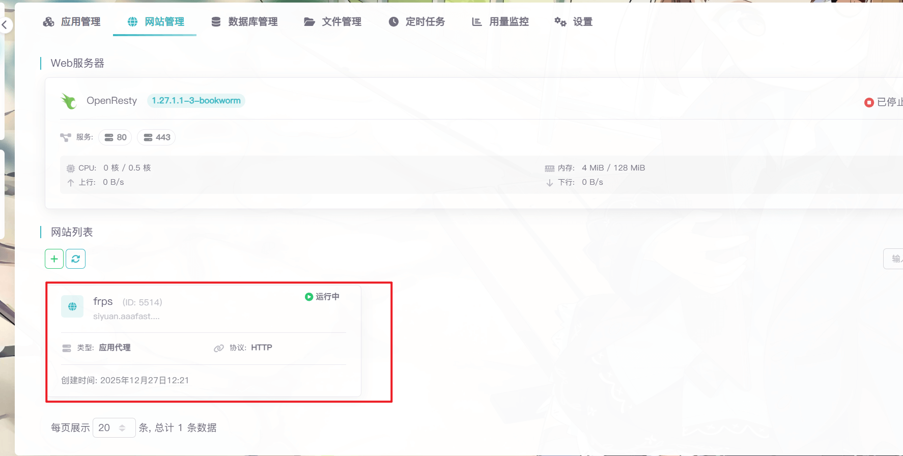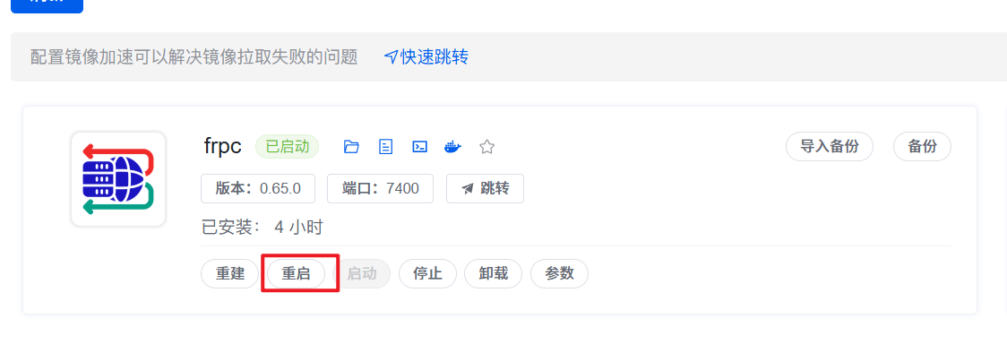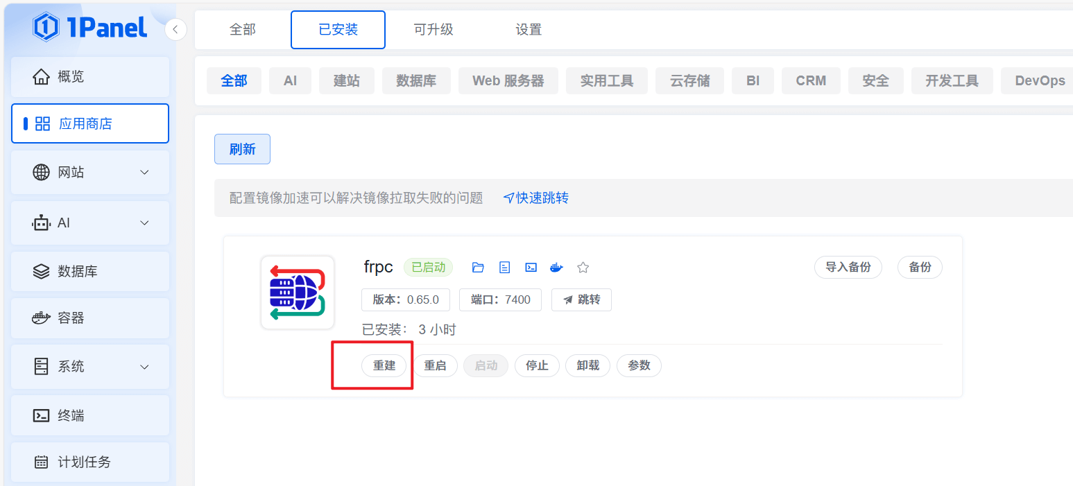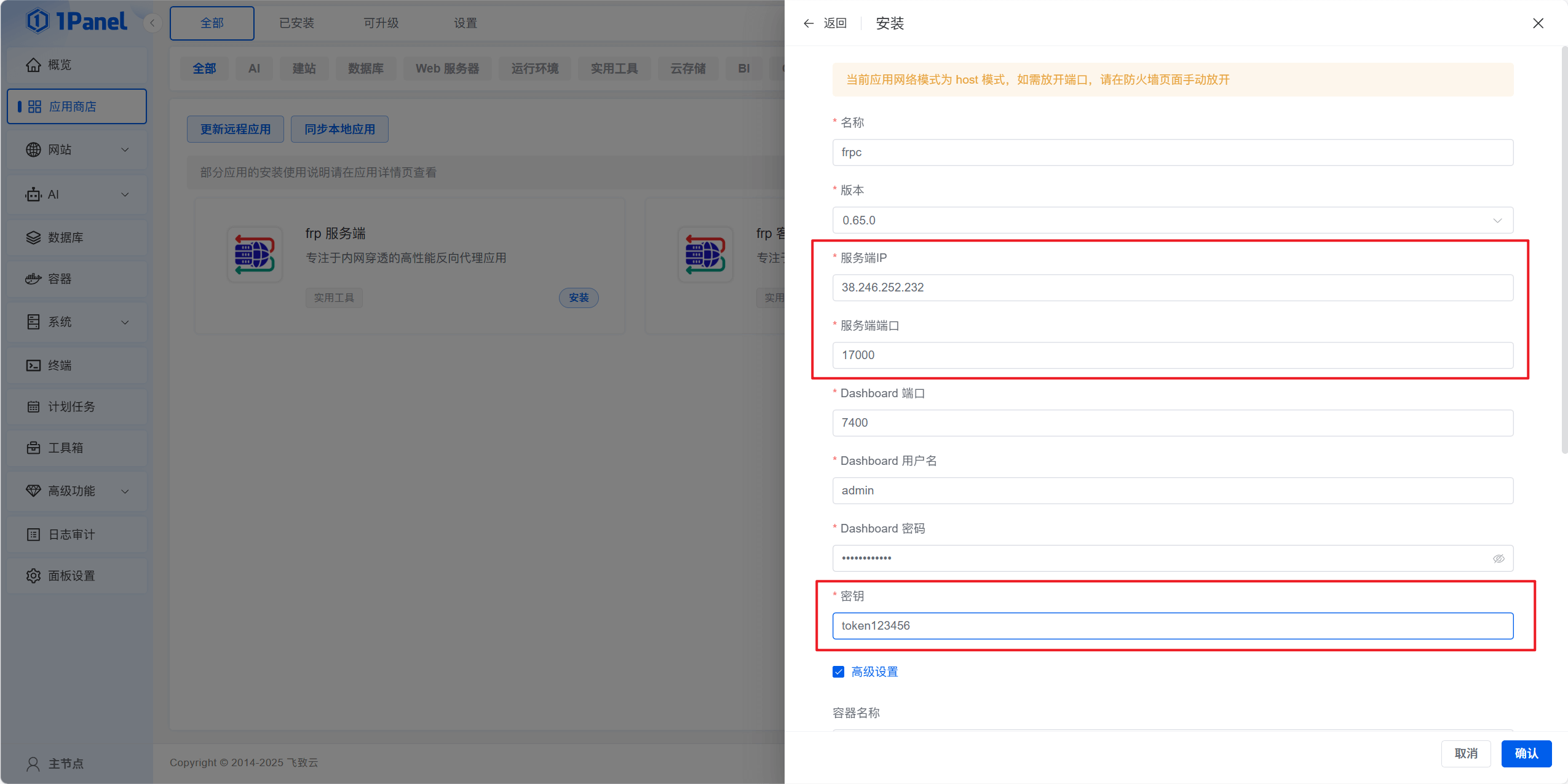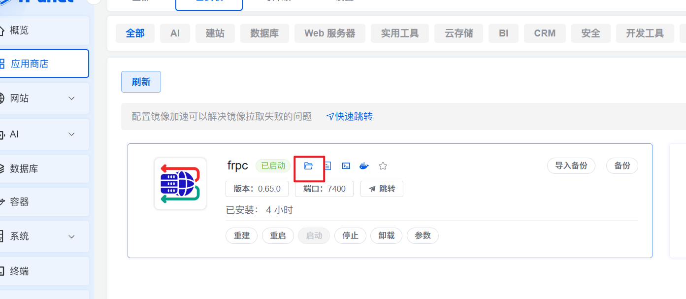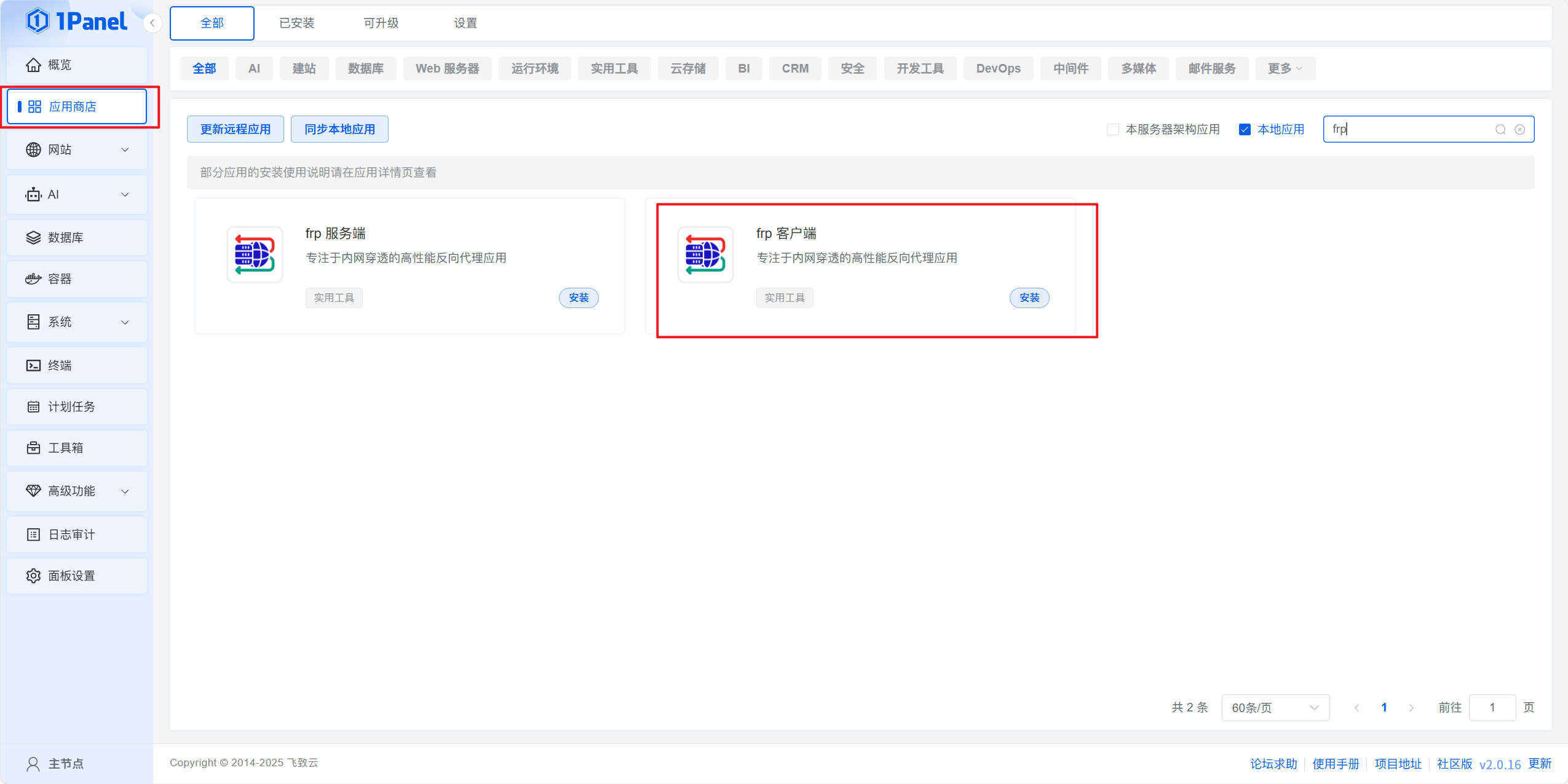 映射完成后,访问1Panel,点击应用商店➡️搜索frp➡️安装frp客户端