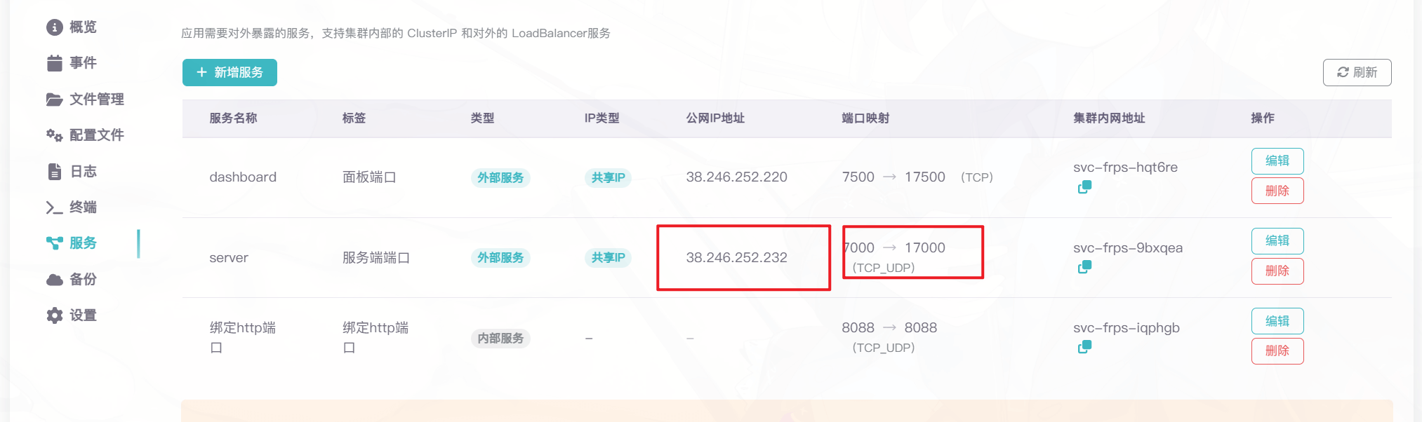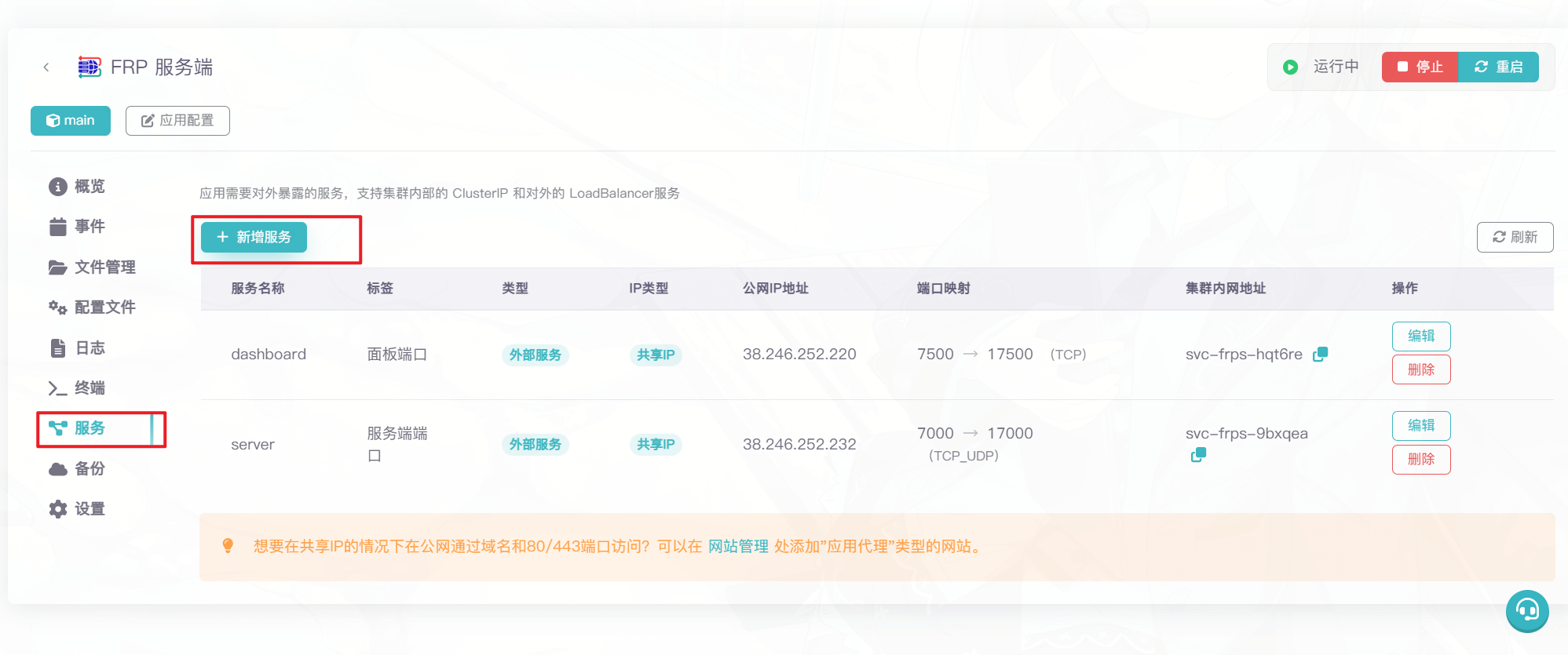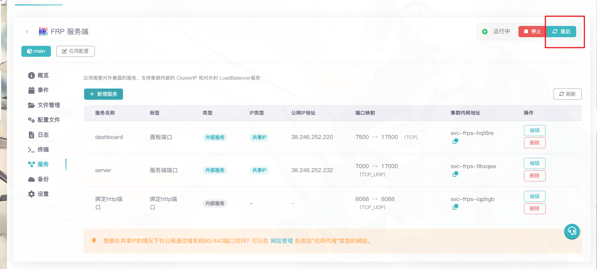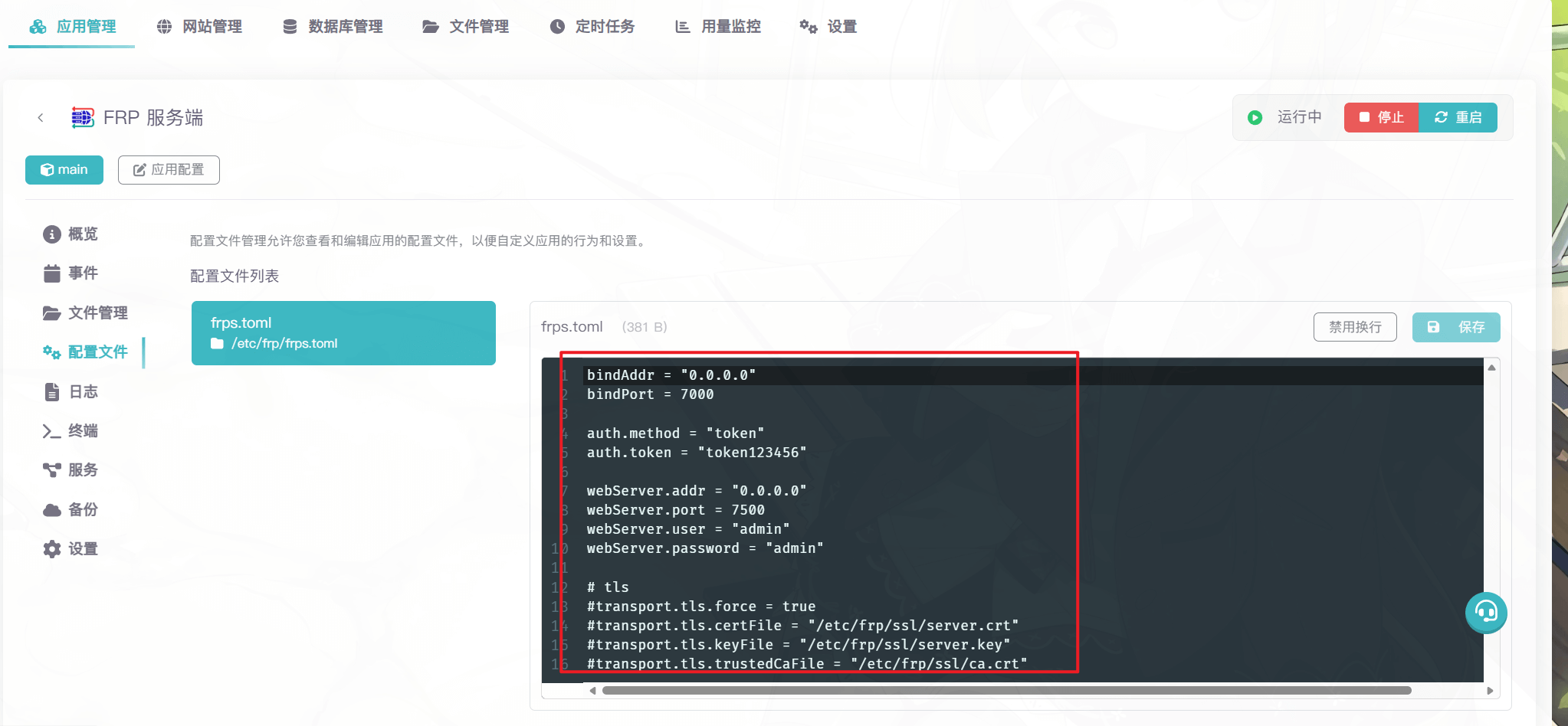 编辑这个配置文件,token用来连接这个FRPS,请设置复杂一点的密码,webServer.password是服务端UI页面的登录密码,也需要自行设置,subdomainHost是你的域名,修改完成后点击右上角的保存