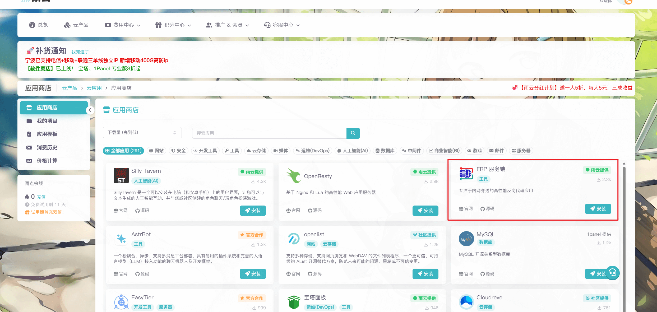 FRP可以帮助大家用域名访问没有独立IP的服务器,比如nas、挂机宝之类的,之前我专门租的香港服务器运行frp,结果速度非常不理想,这次试了试雨云的香港集群的frp,速度非常快,而且首充双倍雨点,算下来比租大带宽优线路的服务器实惠多了。