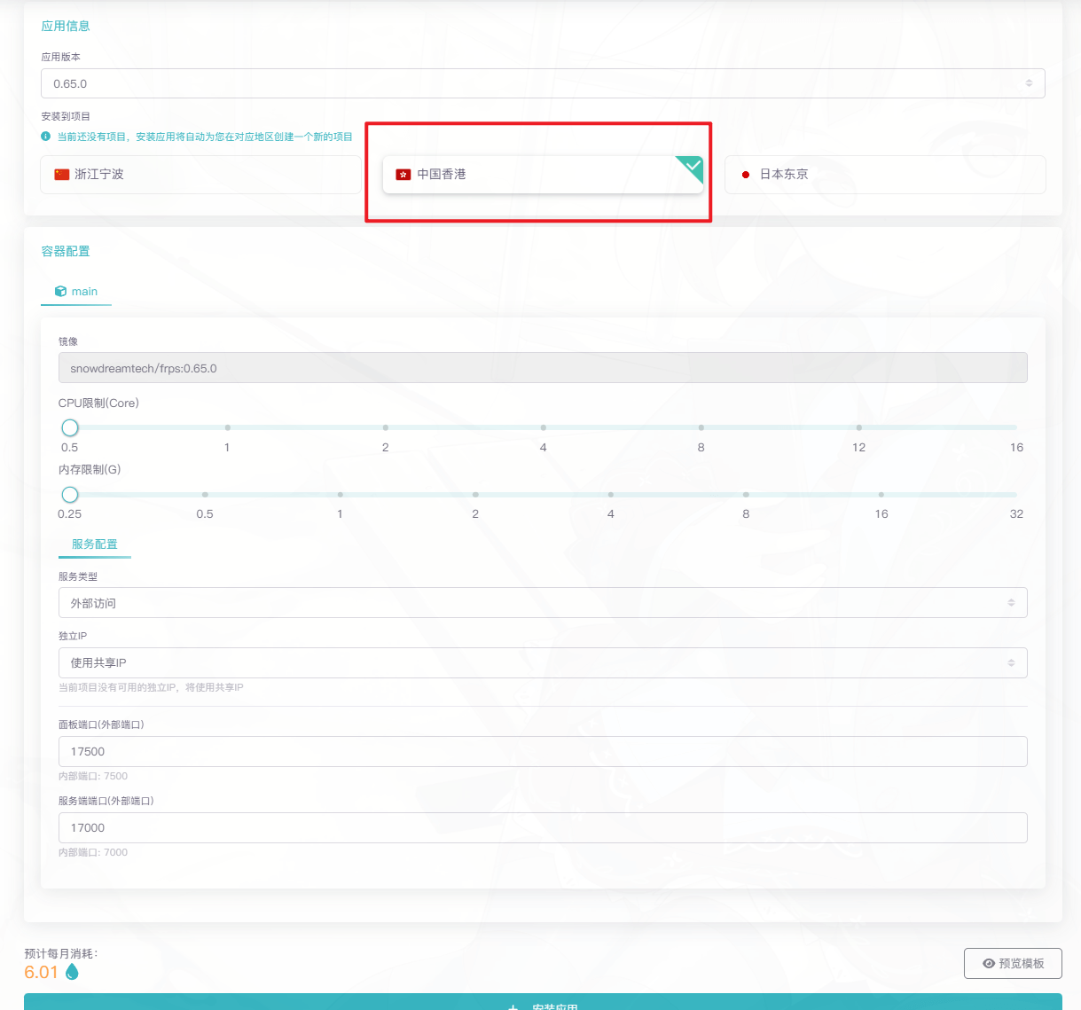 这里选择中国香港,因为免备案,不要选日本,虽然也免备案,但是延迟太高了。配置都选最低的就行,frp不吃配置,端口随意