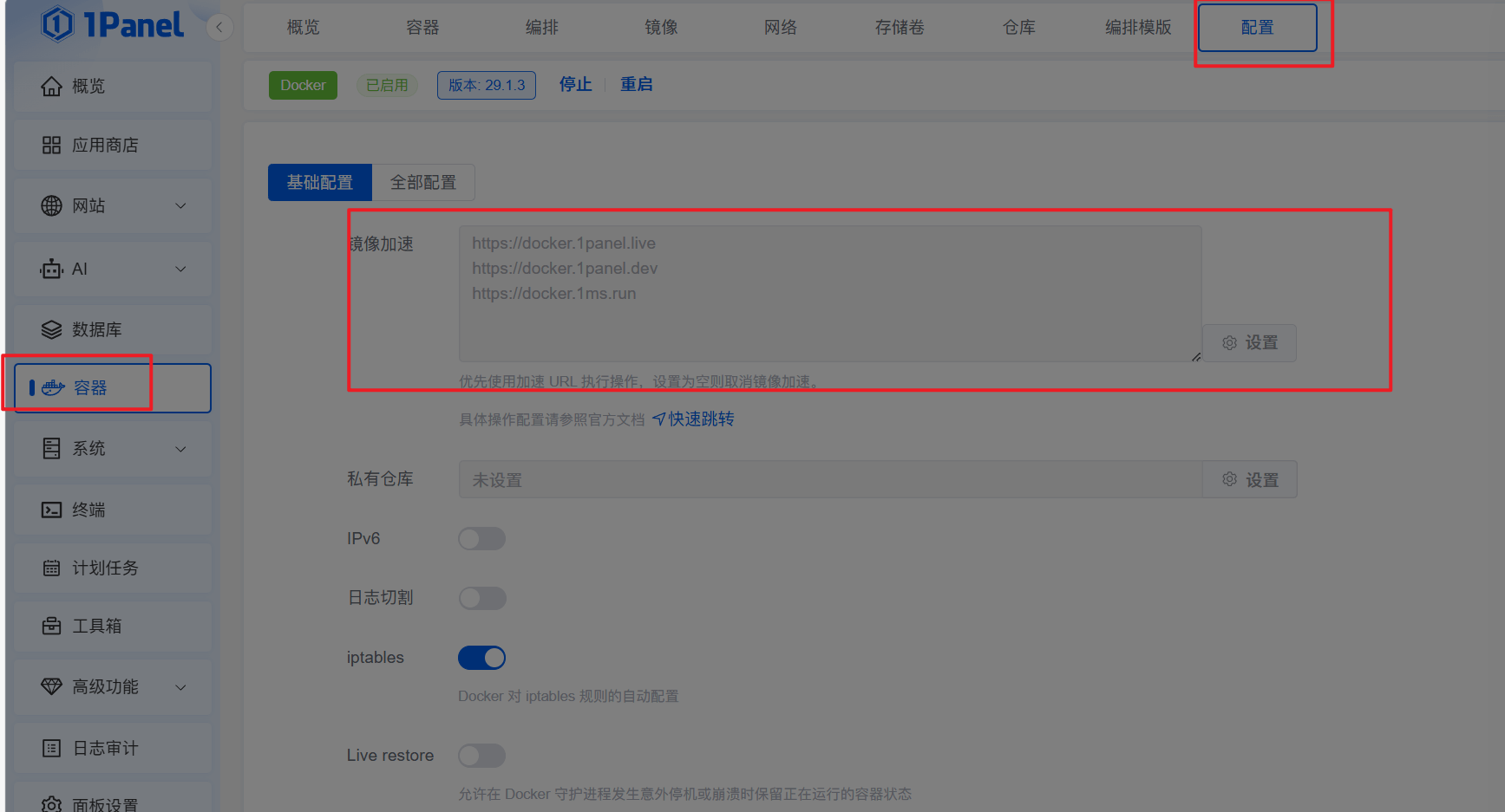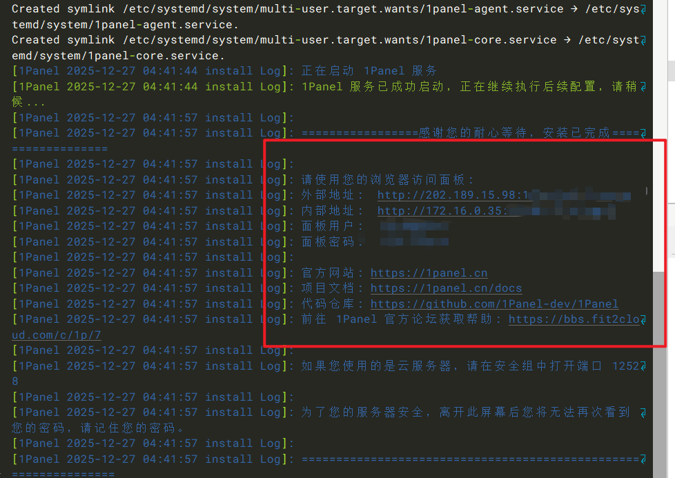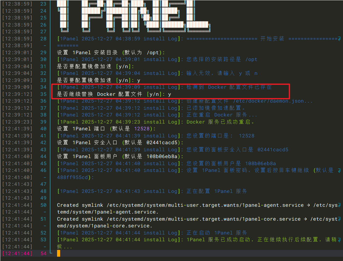根据提示安装1panel,一般就这里的是否配置镜像加速需要输入y,其他的都直接回车用默认值就行