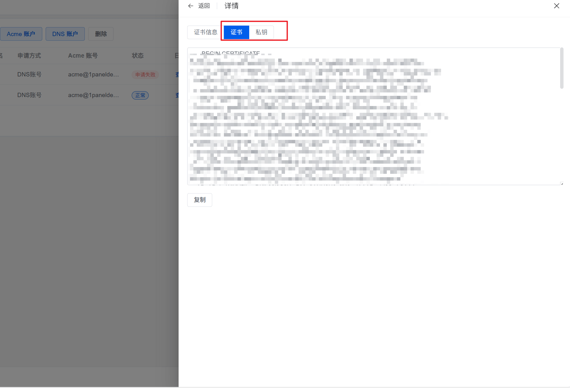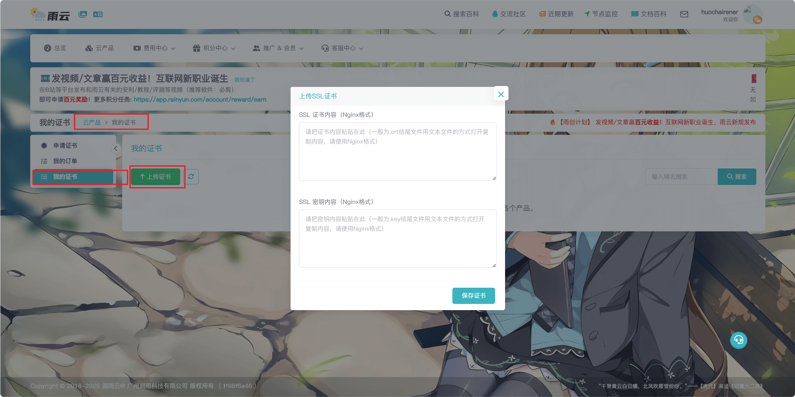 回到雨云,找到云产品➡️我的证书,将证书和私钥复制进去,保存即可