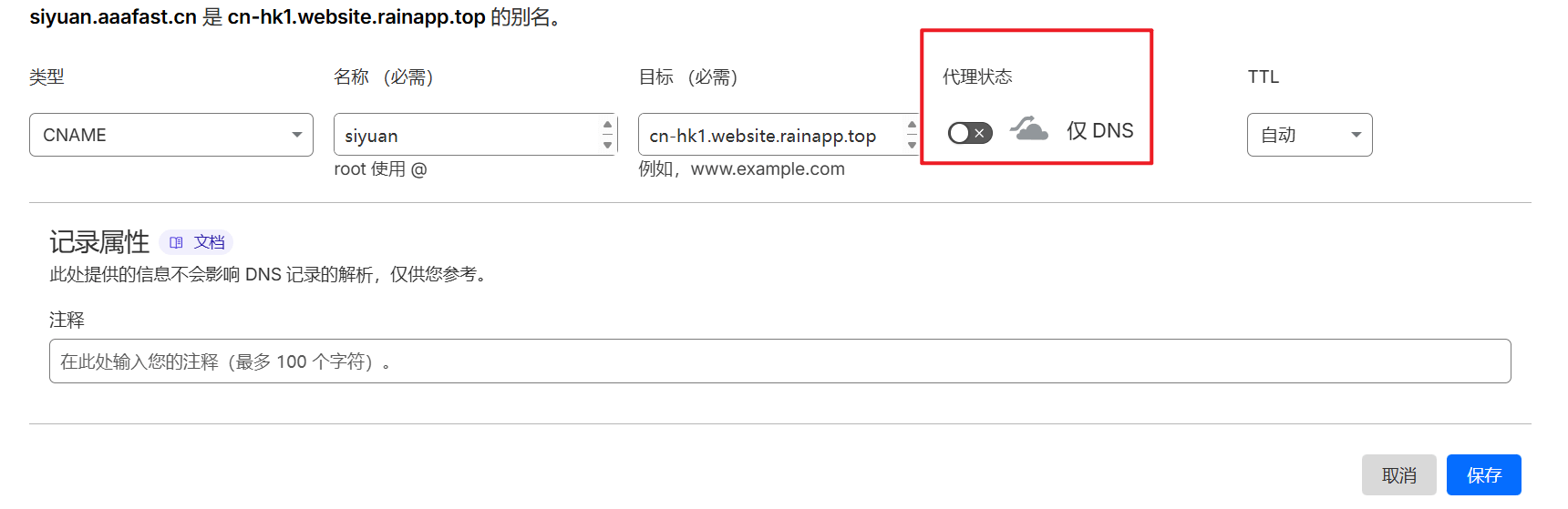 前往你的DNS解析服务商处添加cname解析,我这里是cloudflare,代理状态一定要是关闭,不然雨云无法验证通过