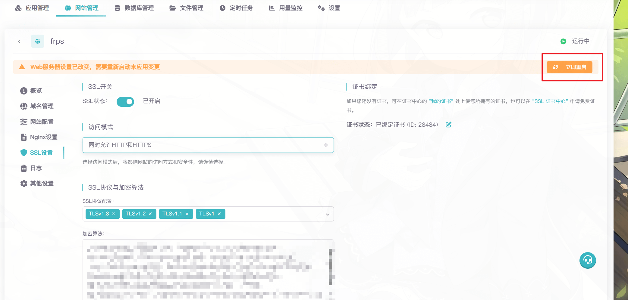 开启SSL后会提示需要重启,点击立即重启即可,然后就可以通过https访问了