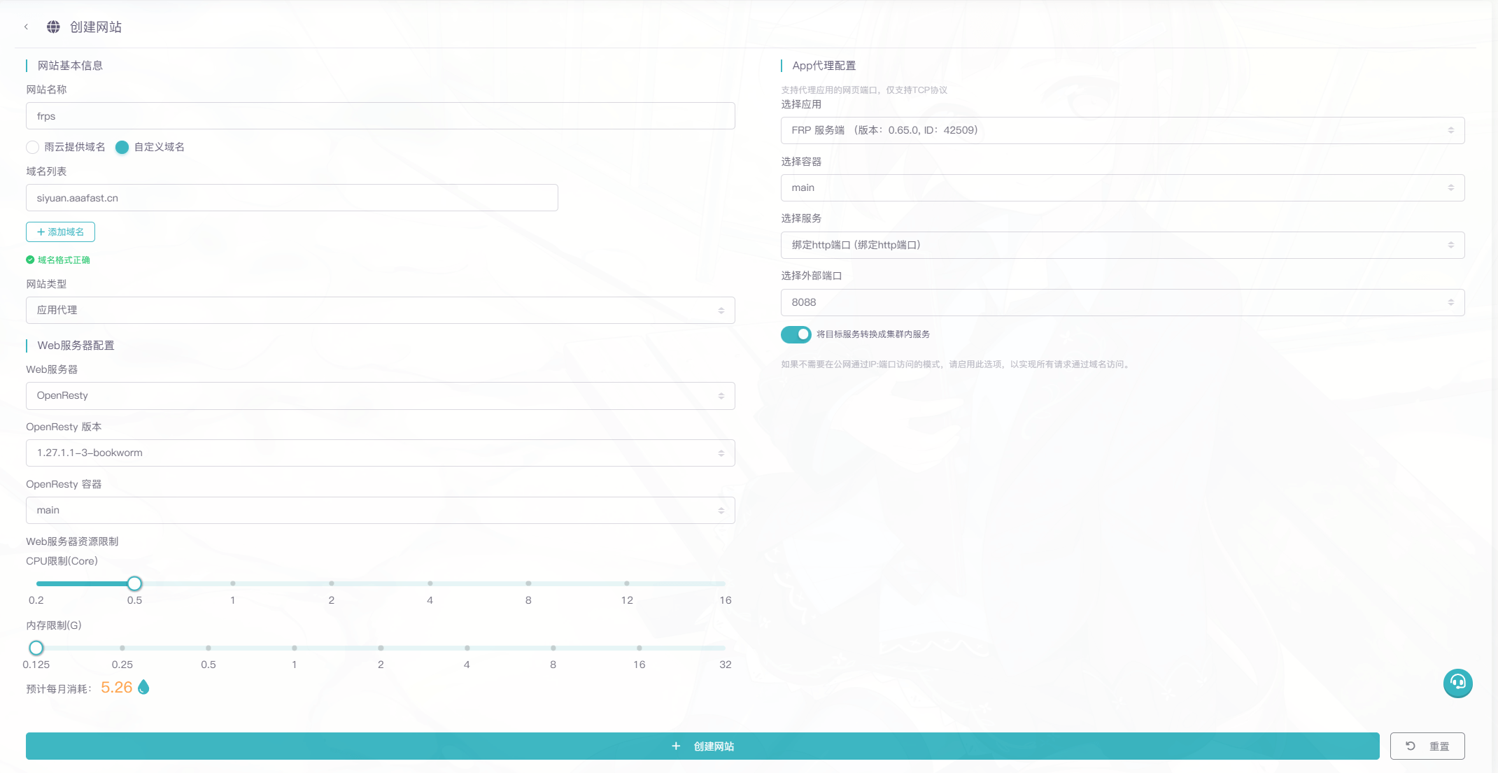 按照如下填写,域名列表要填刚才配置的subdomainHost的子域名,服务器资源最低就是0.5核,不然不让创建。我这里是想代理我的思源笔记页面,所以直接帮的siyuan.aaafast.cn,之后可以继续绑其他多个域名,这里无需纠结