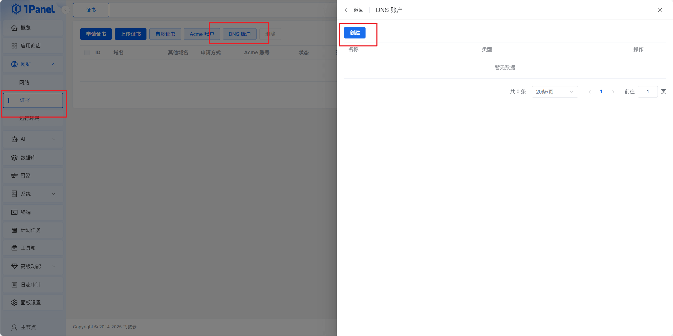 使用1Panel免费申请通配符域名证书,先创建DNS账户