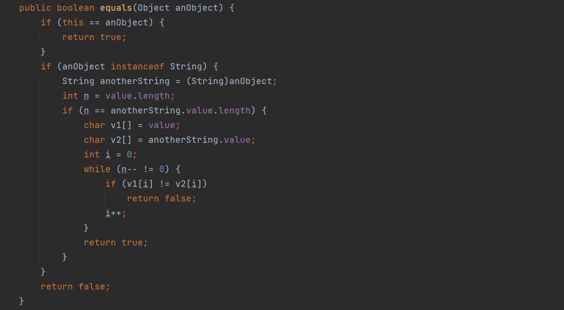 基于底层 char[] value 数组,逐位比较对应位置字符的 Unicode 码点值,比对过程中,只要发现任意一位的字符不匹配,方法立即终止并返回 false,若所有位的字符均匹配,方法返回 true。