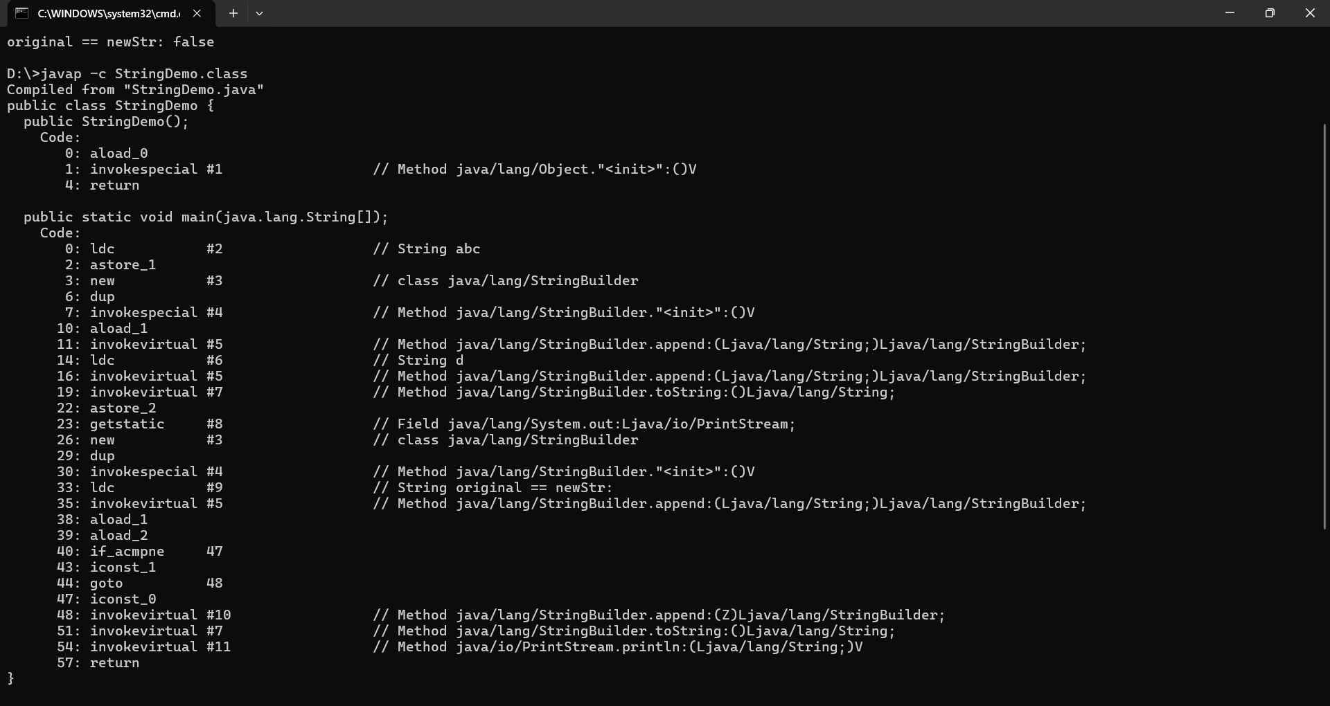 在终端运行 javap -c StringDemo.class 进行反编译,反编译结果如下: