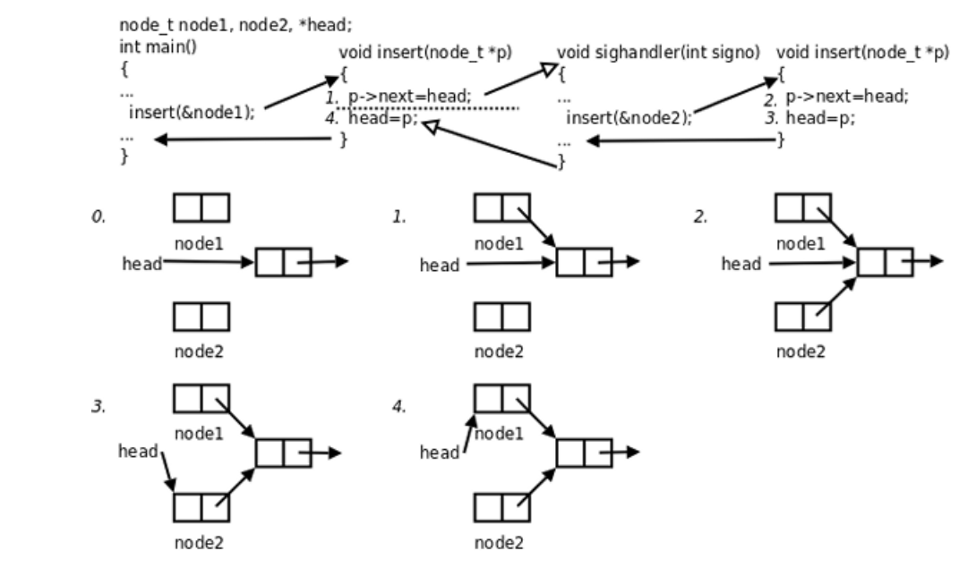 main函数调用insert函数向一个链表head中插入节点node1,插入操作分为两步,刚做完第一步的 时候,因为硬件中断使进程切换到内核,再次回用户态之前检查到有信号待处理,于是切换 到sighandler函数,sighandler也调用insert函数向同一个链表head中插入节点node2,插入操作的 两步都做完之后从sighandler返回内核态,再次回到用户态就从main函数调用的insert函数中继续 往下执行,先前做第一步之后被打断,现在继续做完第二步。结果是,main函数和sighandler先后 向链表中插入两个节点,而最后只有一个节点真正插入链表中了。