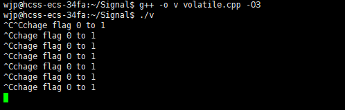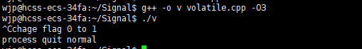 在编译时后面加上面的就代表优化代码的编译,O3的优化也就很高了,这个时候,CPU会把一些它觉得经常使用并且正常情况下没有修改的值存入缓存里面,flag明显符合这个条件,之后CPU对于flag就直接从缓存里面取,所以其实flag在物理内存里面已经改变了,但是CPU从缓存读取,没有改变,所以也就出现了flag值不改变的情况。